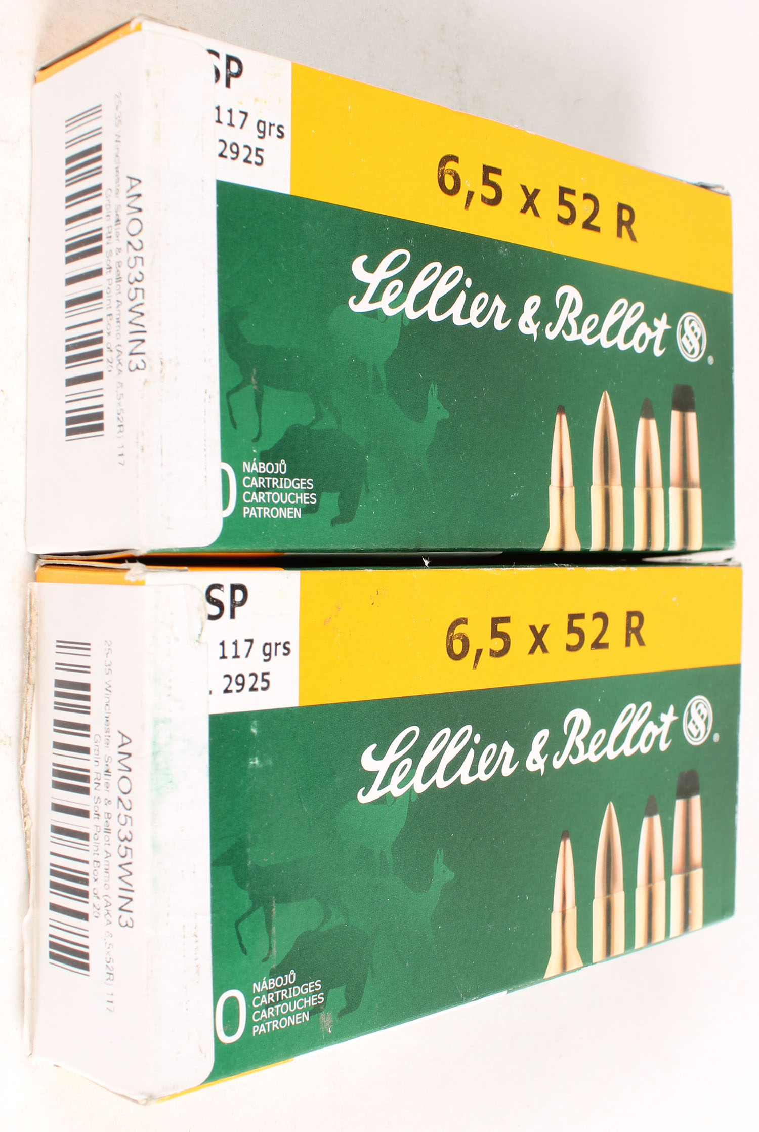 Lot of 2 Sellier & Bellot, 6,5 x 52 R (25-35 Cal.), 117 Gr, Full, 1pc. Green yellow & white box, boxes are solid with excellent color, ammo is excellent. Grade: Excellent - Value: 20 to 60