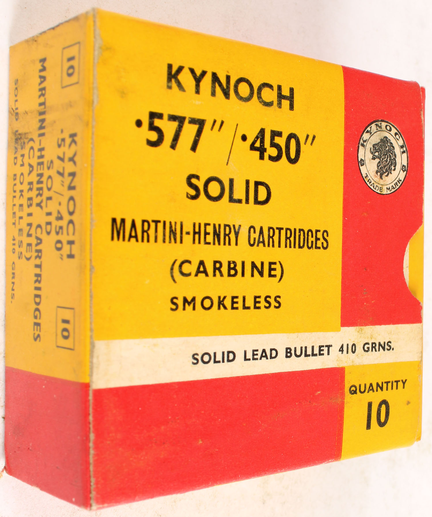 Kynoch, .577/.450 Solid Martini-Henry Cartridges, 410 Gr. Solid Lead, Full, 1pc. Multi-colored box, box is solid with excellent color, Ammo is good. Grade: Very Good + - Value: 30 to 90