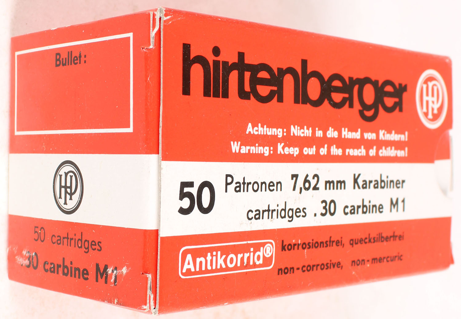 Hirtenberger, 7.62mm Karabiner (.30 Carb M1), Full. 1pc, Multi-colored box is near mint, ammo is excellent. Grade: Excellent ++ - Value: 30 to 60
