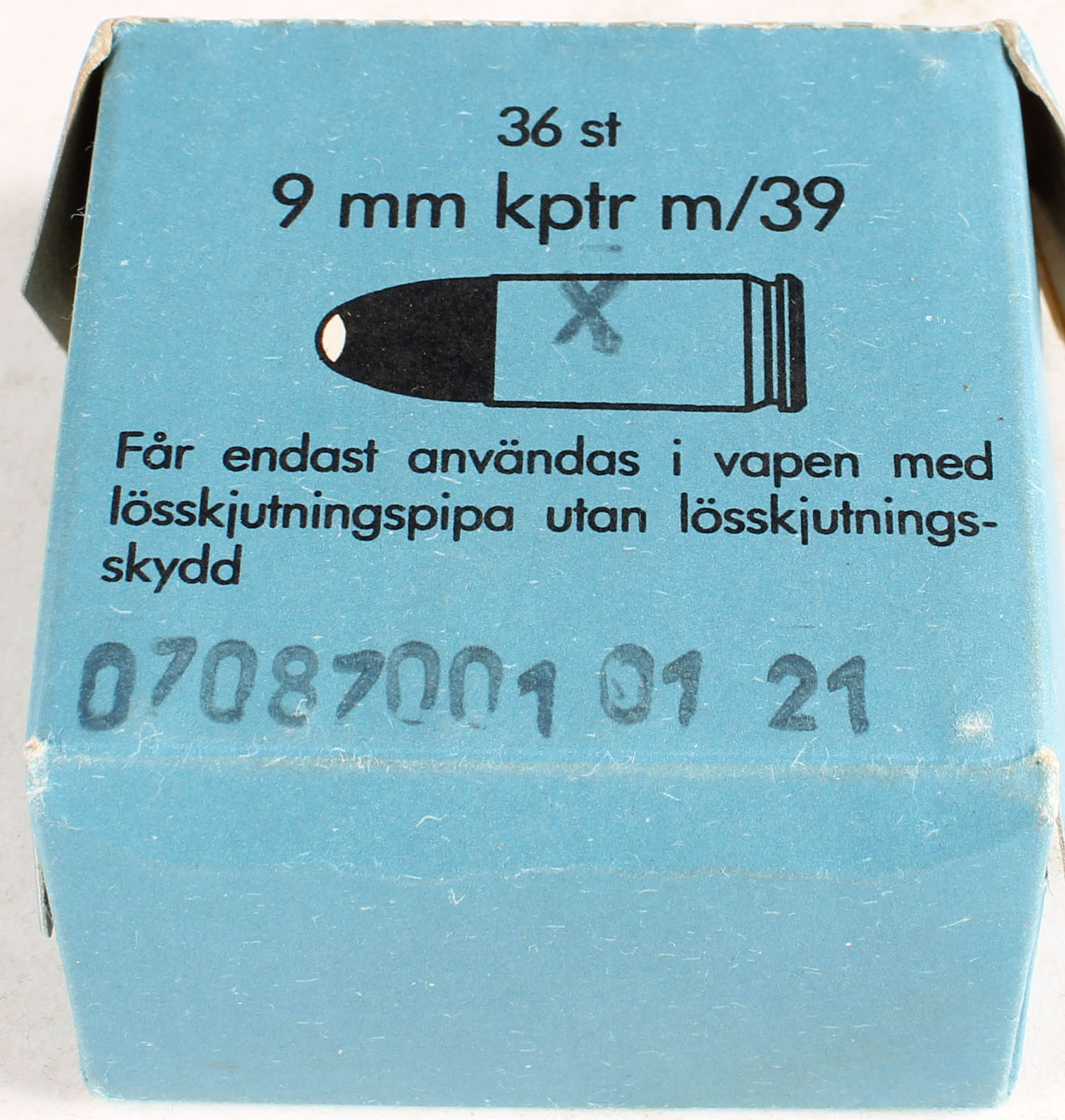 Swedish, 9mm kptr m/39 training ammo, CAUTION this is special training ammo that was used with guns with special barrel inserts, shooting this ammo in a standard gun chambered in 9x19mm will cause barrel damage, it is a composite bullet with a smaller steel ball bearing inside, when fired in a standard 9mm gun, the composite bullet with disintegrate and leave the ball bearing bouncing around In the barrel on its way out causing damage, only buy this ammo to collect not to fire, 1pc, Full, blue box with black print, boxes are solid. Grade: Excellent - Value: 10 to 20