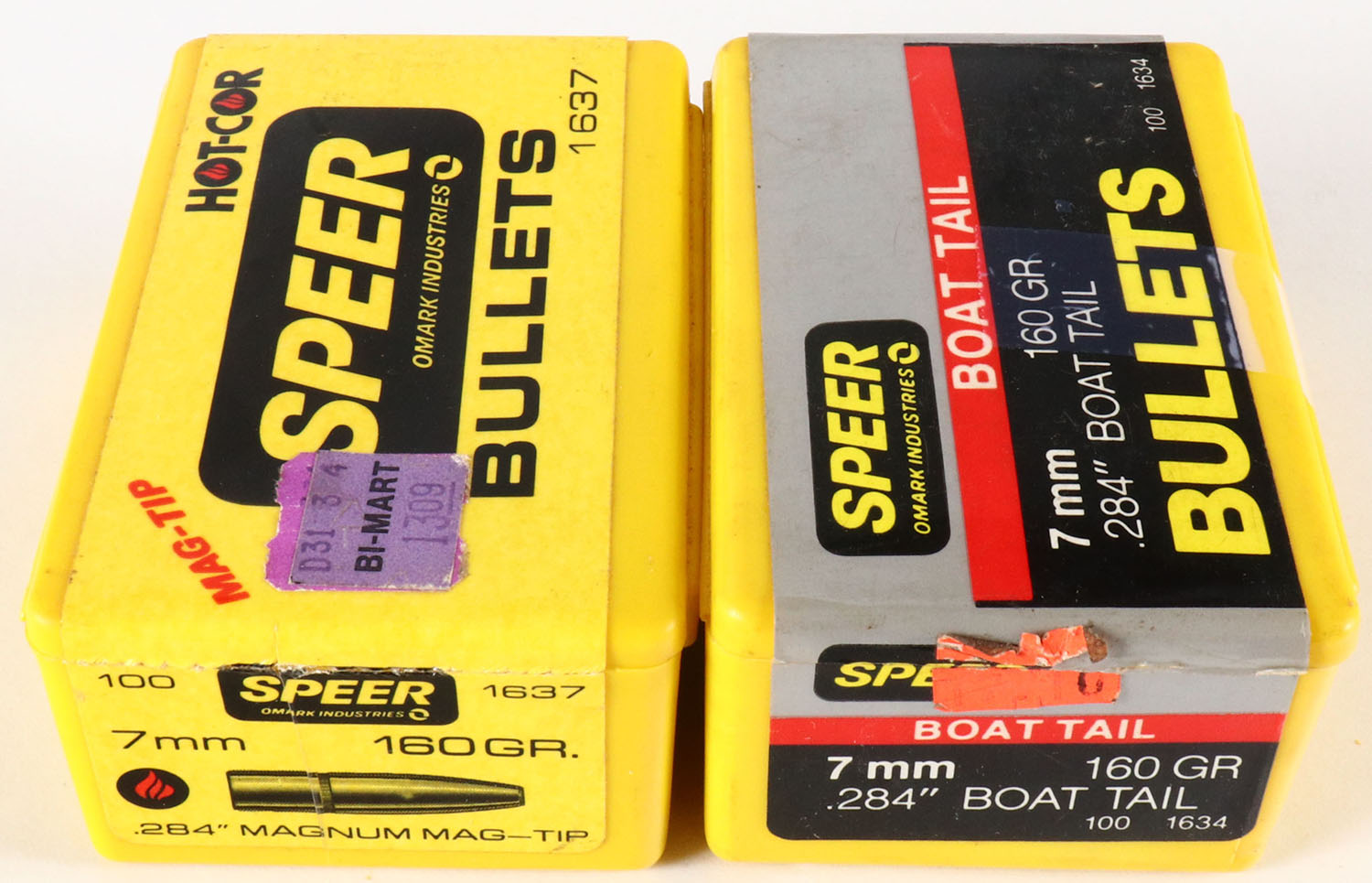 Lot of 2 Speer, 7mm, 160 Gr., .284'' Boat Tail & .284'' Magnum Mag-Tip, Full, Yellow boxes with multi-colored label, boxes are solid with age soiling, labels are intact. Grade: Very Good ++ - Value: 20 to 50