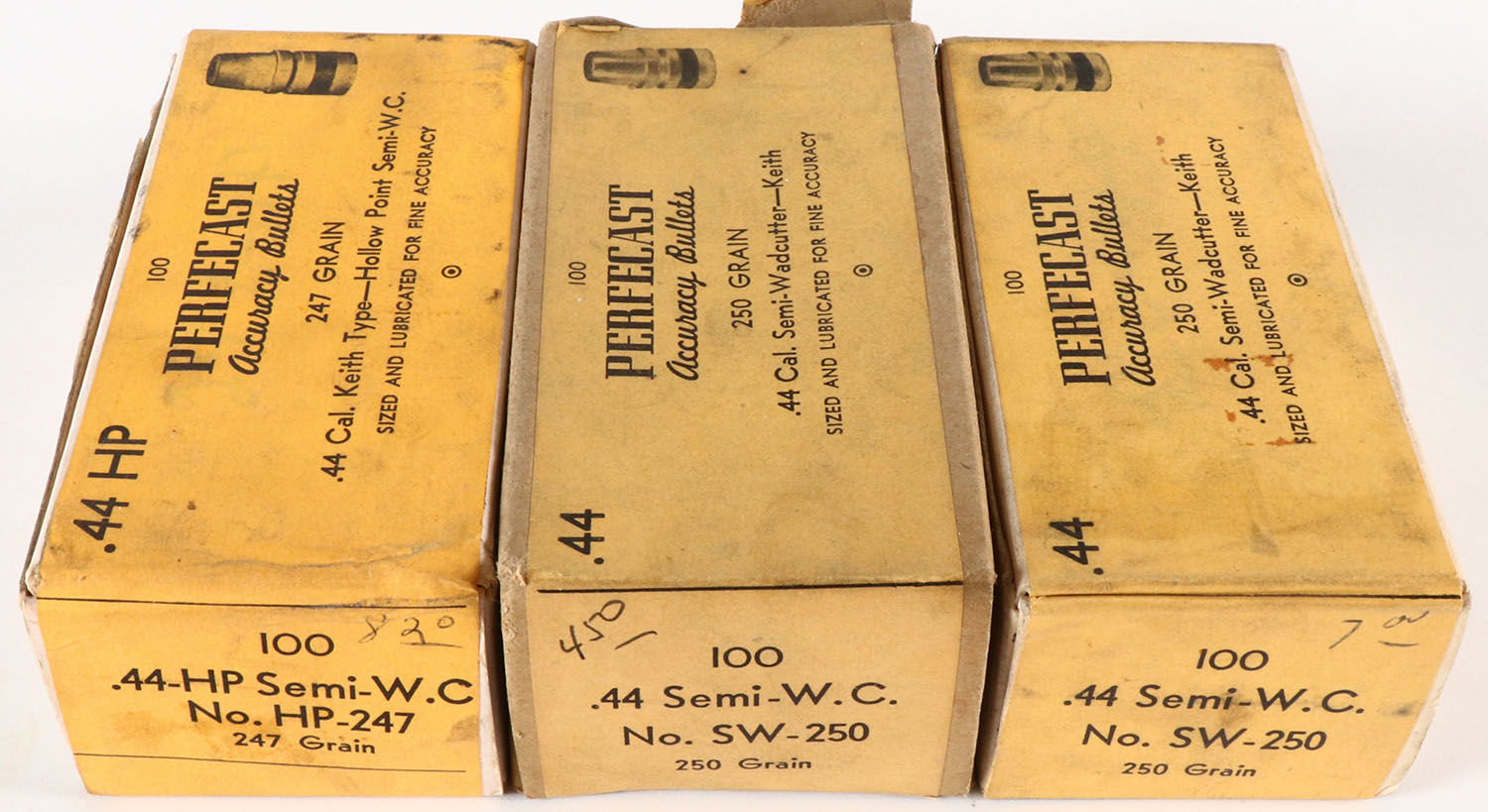 Lot of 3 Perfecast, .44 Cal. Semi-Wadcutter, 250 Grain, Appear Full, 1pc, boxes are very solid. Grade: Excellent - Value: 20 to 60
