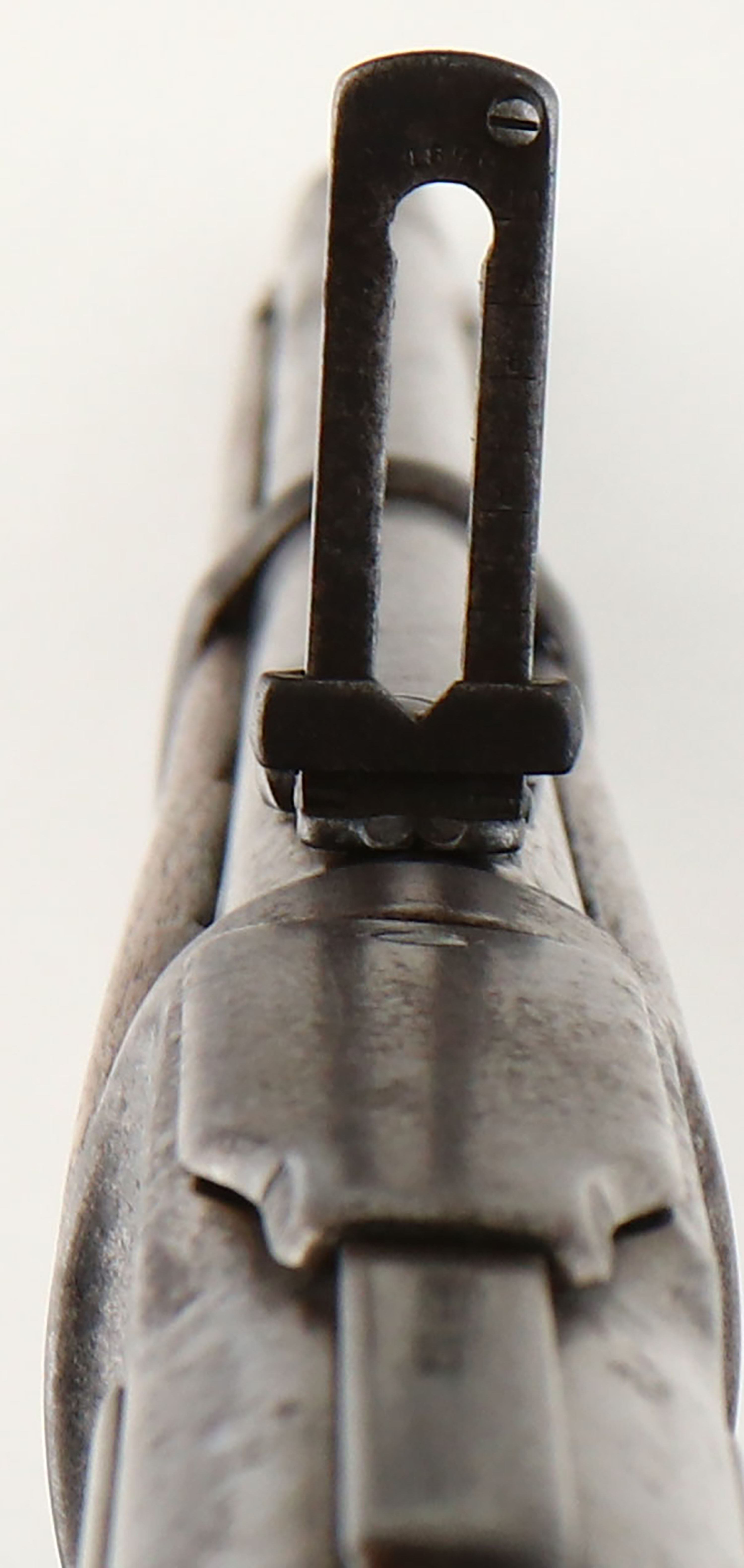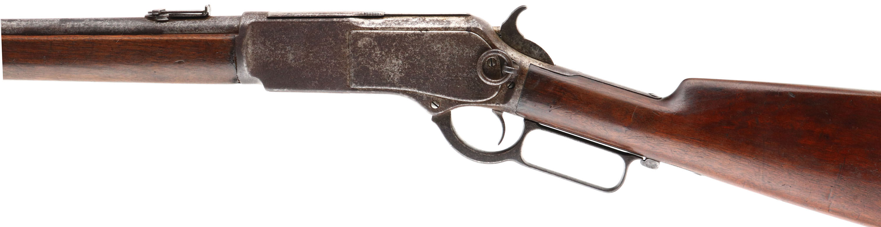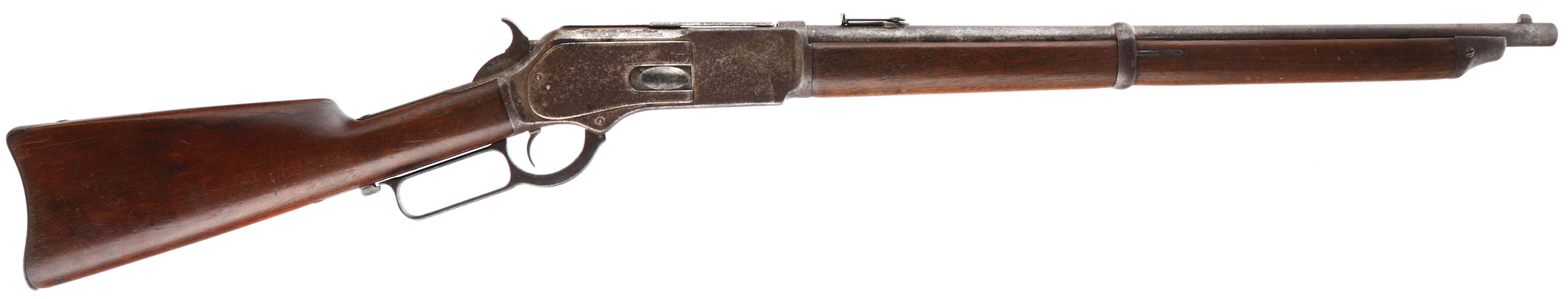 RARE Winchester, Model 1876 ''Centennial Rifle'', Saddle Ring Carbine, 3rd Variation, CAL: 45-75, MFG: 1884, SN: 43428, Lever Action Carbine, 22'' Round barrel, Full mag. The Model 1876 was originally referred to as the Centennial Rifle due to its introduction in the same year as America's Centennial anniversary. Nearly the entire production of the big Model 1876 Winchester was devoted to rifle manufacture. There was a considerable contract for carbines from the Canadian Northwest Mounted Police, but aside from these historic arms, Winchester made carbines for the civilian market on a very limited basis. Total production of all Model 1876's from 1876 to its discontinuance in 1888 (with about 300 additional arms made intermittently to 1898) was a mere 63,871. In comparison, Winchester produced 323,926 of the smaller Model 1873's from 1873-1889. By the end of production of the Model 1873, 720,609 had been produced, More than 10 fold that of the 1876. For this obvious reason, all Model 1876 Winchesters are scarce. The 1876 Saddle Ring Carbines are seldom encountered today as so few were made. Northwest Mounted Police carbines (Mountie Carbines) were a special variant used by the Canadian Northwest Mounted Police. They had a 22'' (56 centimeters) round barrel, were chambered in .45-75 Winchester, with a full length forend & a military style folding ladder rear sight calibrated in meters. This carbine is configured the same, but carries the standard ''1876'' marked folding ladder rear sight, with slide marking from 2 to 10. This carbine was built for the civilian market & is much rarer. The original straight grip wood stocks are excellent, displaying the original finish. They display several minor contusions, scrapes & scratches, with a few little edge nicks to the back edge of the forend. The metal blue finish has entirely tone to a mix of speckled brown patina, gray darkened finish & areas worn to gun metal gray. Bore is very good, displaying light spotting & pitting amongst strong rifling. In addition to the flip-up rear ladder sight, the barrel carries a box small blade carbine front sight. Buttstock carries a carbine metal buttplate. Original saddle ring. A rare & all original 1876 SRC collectible. Antique, No FFL Req. - Value: 7000 to 12000