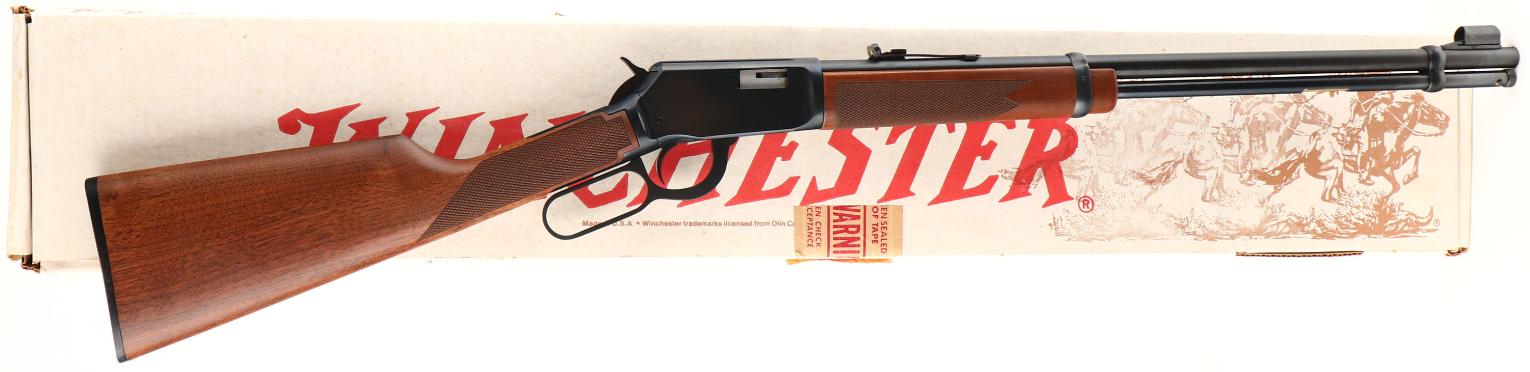 Winchester, Model 9422M Carbine, CAL: marked .22 WIN MAGNUM, MFG: 1974, SN: F663605, Lever Action Rifle, 20 1/4'' Round barrel. The checkered straight grip walnut stocks are excellent, near mint. The metal blue finish rates 99% overall. Bore is excellent. Barrel holds an adjustable rear elevator sight & large hood front sight. Buttstock carries a Winchester marked, checkered black plastic buttplate. Comes in the original factory box, with tissue, paperwork & hang tag, FFL or C&R Req - Value: 800 to 1200