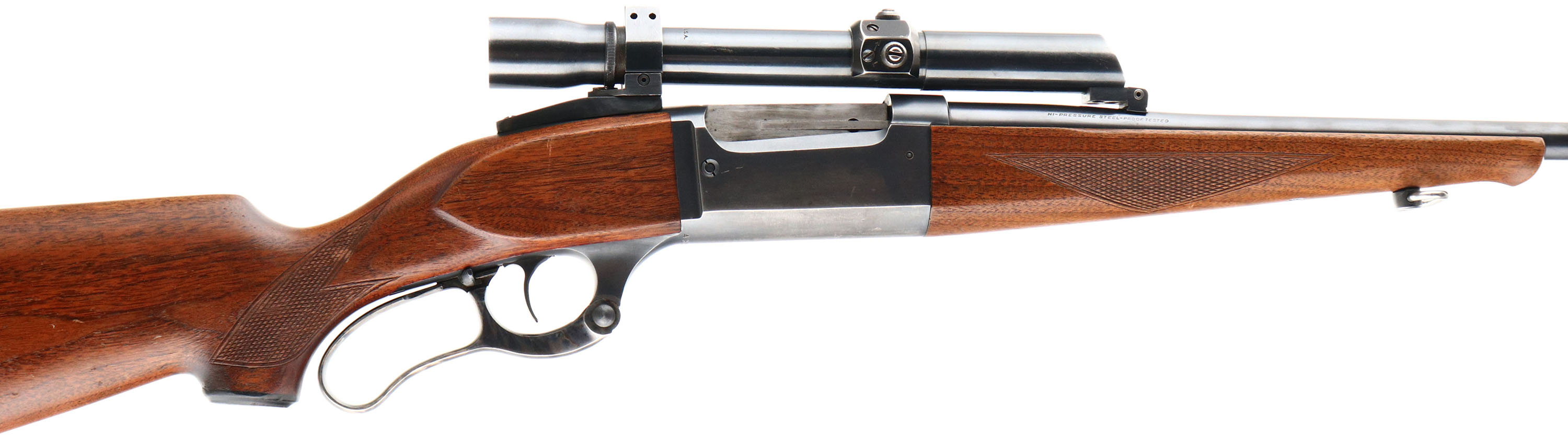 Savage, Model 99, marked 300 Savage Cal., MFG: 1945, SN: 433375, Lever Action Rifle, 24'' Round barrel. The original checkered & capped pistol grip wood stock & Schnabel forend are excellent, with minor scratches, scuffs & scrapes to the original thinning finish. The original metal blue finish on the barrel rates 80%, 60% on the receiver & case-colors on the lever. The rifle is fitted with a Weaver K 2.5 scope, while the barrel carries a ramped tall blade front sight. Bore is excellent. The stock carries a grooved plastic buttplate. Action remains smooth & tight. Sling swivels. A very nice example. FFL or C&R Req. - Value: 800 to 1500