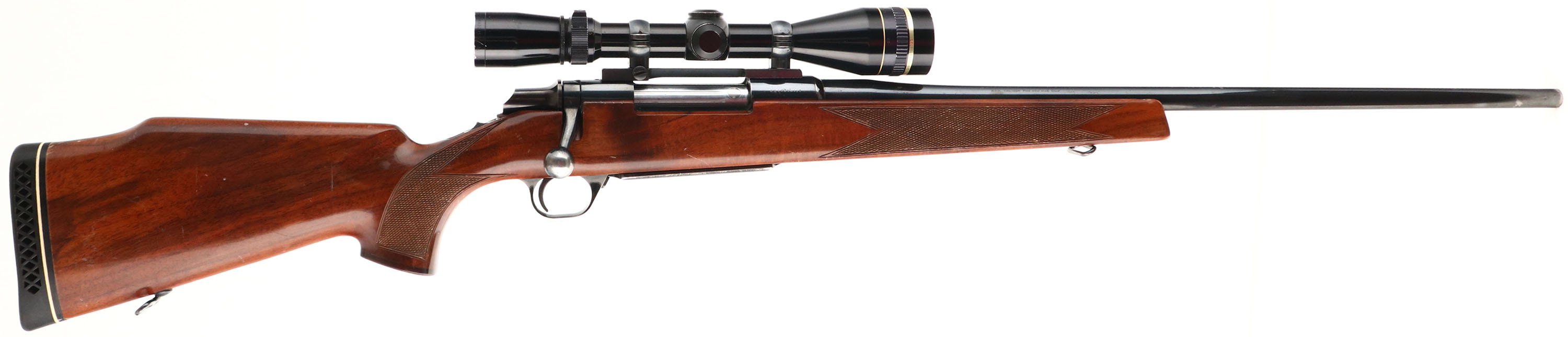 Browning, Model B.B.R., marked Cal. 7mm REM MAG. Only, MFG. 1979, Japan, SN: 02443RN117, Bolt Action Rifle, 24'' Round barrel, The factory checkered, cheeked & flat pistol grip Monte Carlo wood stock is excellent & original. There are numerous minor scratches, scuff & contusions to the original high gloss finish. The original metal blue rates 85% overall, with most of the loss due to spotting or speckling. Floorplate & trigger guard show a bit more wear. Receiver carries a Leupold Vari-x-III 3.5x10 scope on Redfield base, while barrel has no open sight provisions. Bore is excellent. Stock carries a Pachmayr ventilated recoil pad & sling swivels. A very nice original hunting rifle. FFL Req. - Value: 400 to 800