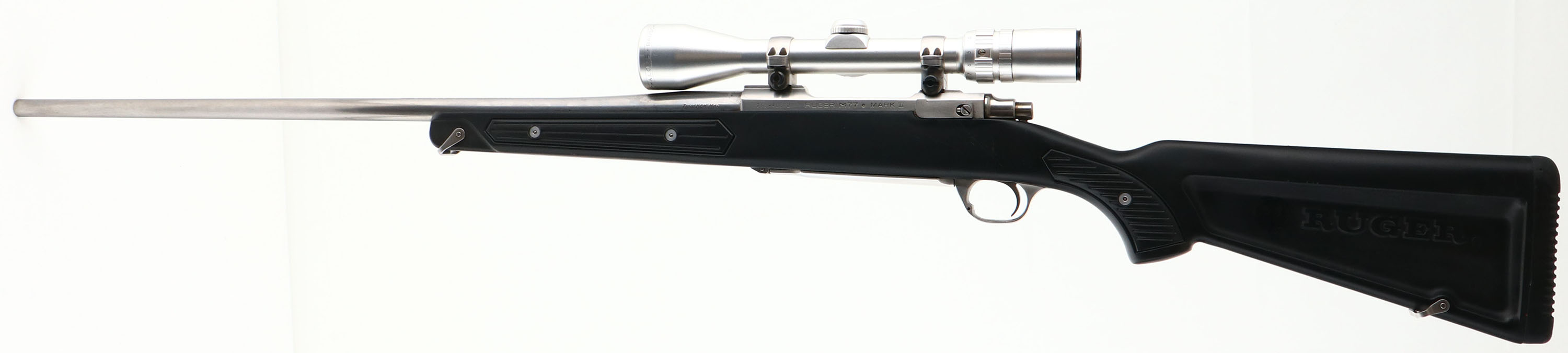 Ruger, Model M77 MARK II, Stainless All Weather, 7 mm REM MAG Cal., MFG. 1995, SN: 783-40592, Bolt Action Rifle, 24'' round barrel, The factory Zytel synthetic stock (sometimes referred to as a skeleton or boat/canoe paddle stock) is excellent, but does have some minor scuffs or scratches. The stainless steel surfaces have a satin silver finish, which is excellent, but with some minor spotting & fine brush lines. The satin silver finish on the floorplate does show some use wear. Bore is excellent, Factory recoil pad & sling loops. Grooved receiver for scope mount. No sight provisions. Fitted with a satin silver matching Bausch & Lomb 3-9X scope. A high quality, all weather, bolt action sporting rifle. FFL Req. - Value: 1000 to 2000