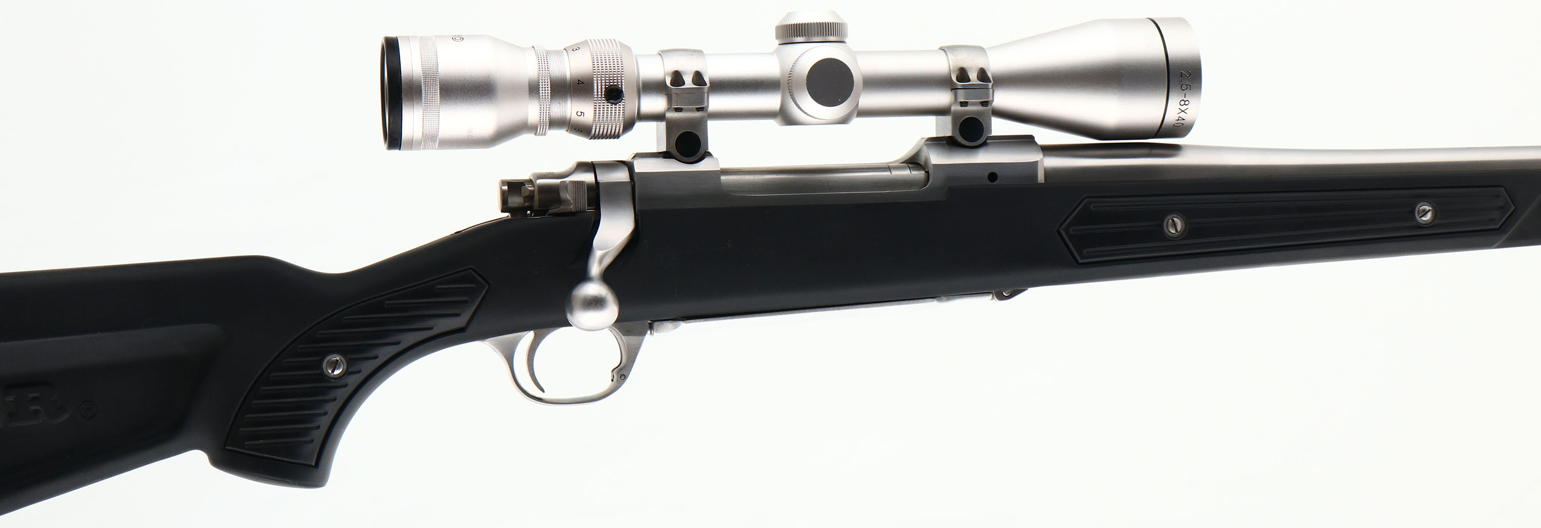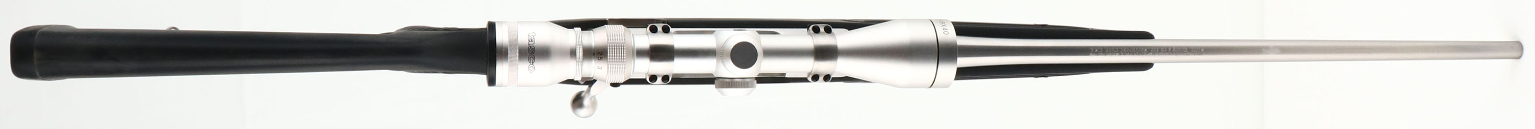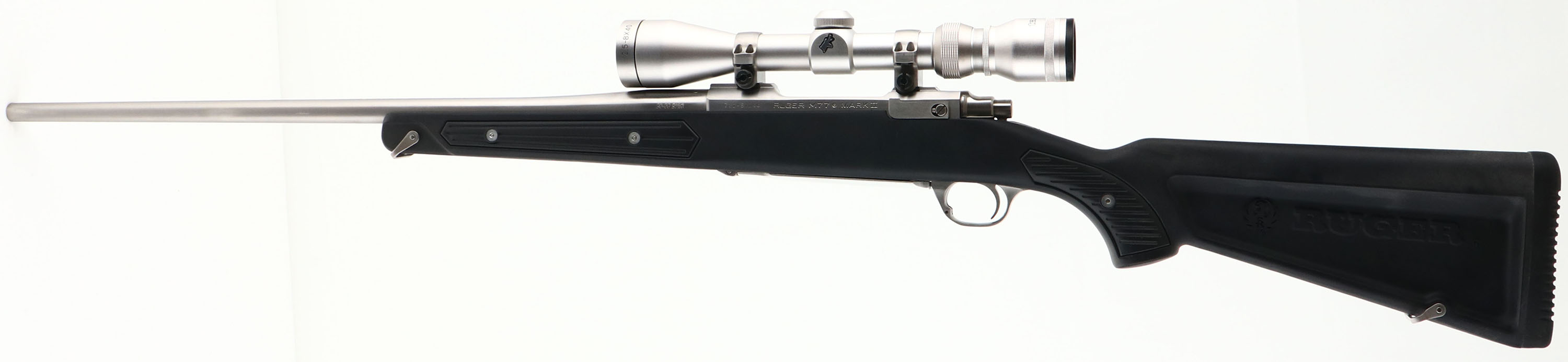 Ruger, Model M77 MARK II, Stainless All Weather, 30-06 SPRG Cal., MFG. 1994, SN: 782-57244, Bolt Action Rifle, 22'' round barrel, The factory Zytel synthetic stock (sometimes referred to as a skeleton or boat/canoe paddle stock) is excellent, with a few minor rubs. The stainless steel surfaces has a satin silver finish, which is excellent, with some very fine brush lines. Bore is excellent, Factory recoil pad & sling loops, Grooved receiver for scope mount. No sight provisions. Fitted with a satin silver matching Tasco 2.5-8X40 scope. A high quality, all weather, bolt action sporting rifle. FFL Req. - Value: 1000 to 2000