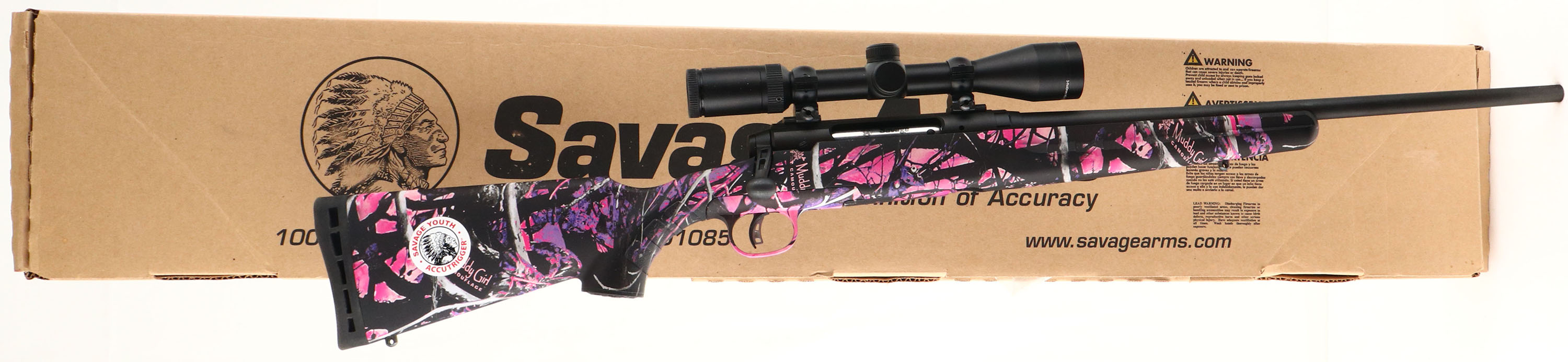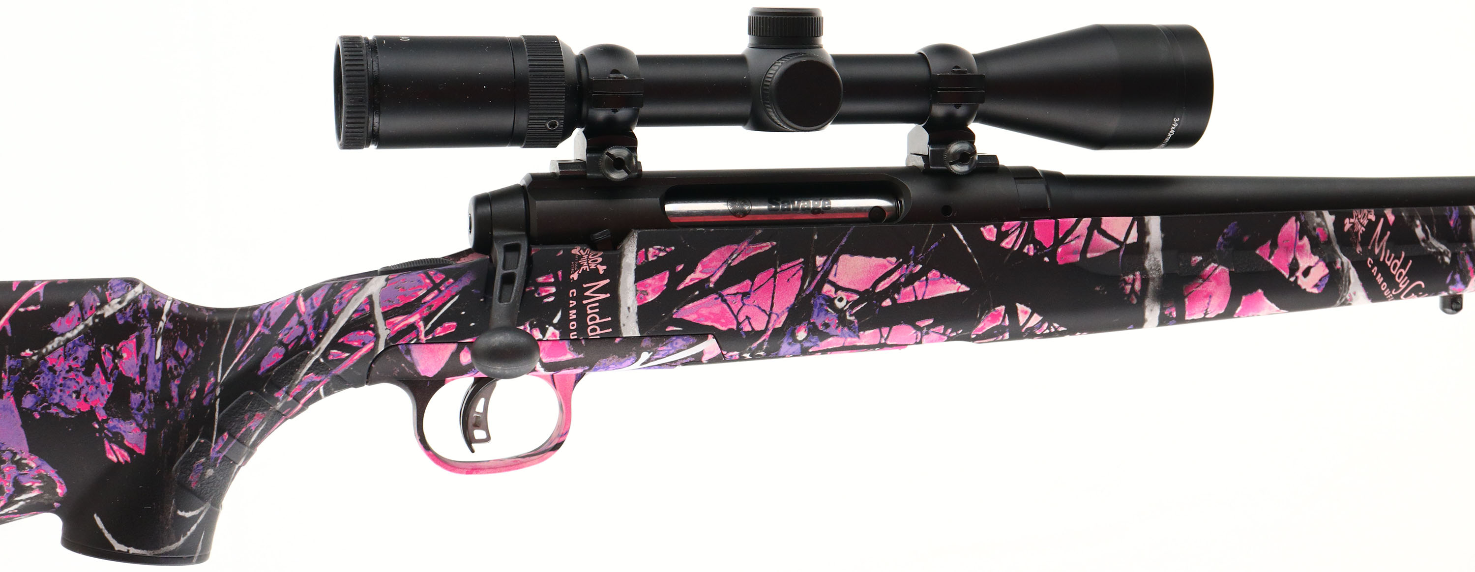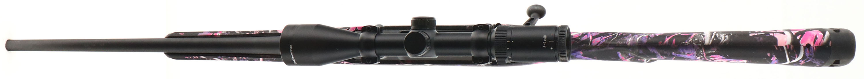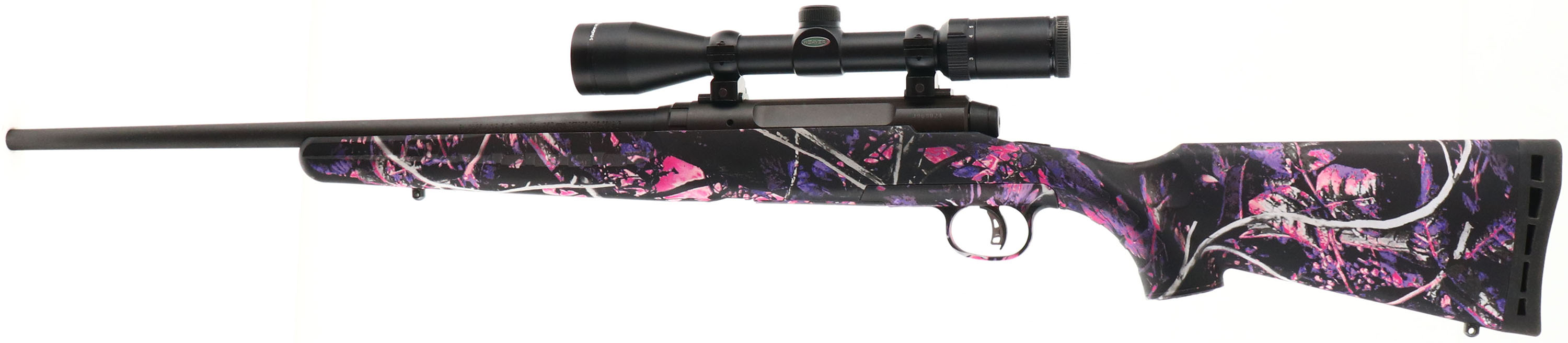 BOXED Savage, Model Axis II XP, 243 Compact (Muddy Girl), CAL: 243 WIN. MFG: Modern, SN:J968024, Bolt Action Rifle, 20 1/4'' 1 in 8 twist barrel. The original capped pistol grip synthetic stock, with Moon Shine Muddy Girl camouflage, is excellent. The original metal black finish on the receiver & carbon steel barrel rates 99% overall. Bore is excellent. Receiver factory mounted with a Weaver 3-9x40 scope, with no open sight provisions. Buttstock carries a ventilated black rubber recoil pad. Adjustable Accu Trigger system. Detachable 4+1 mag capacity. Sling studs. Comes in the original box, with packaging & some papers. FFL Req. - Value: 350 to 550