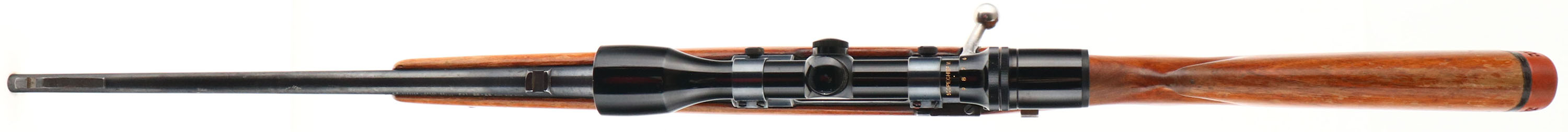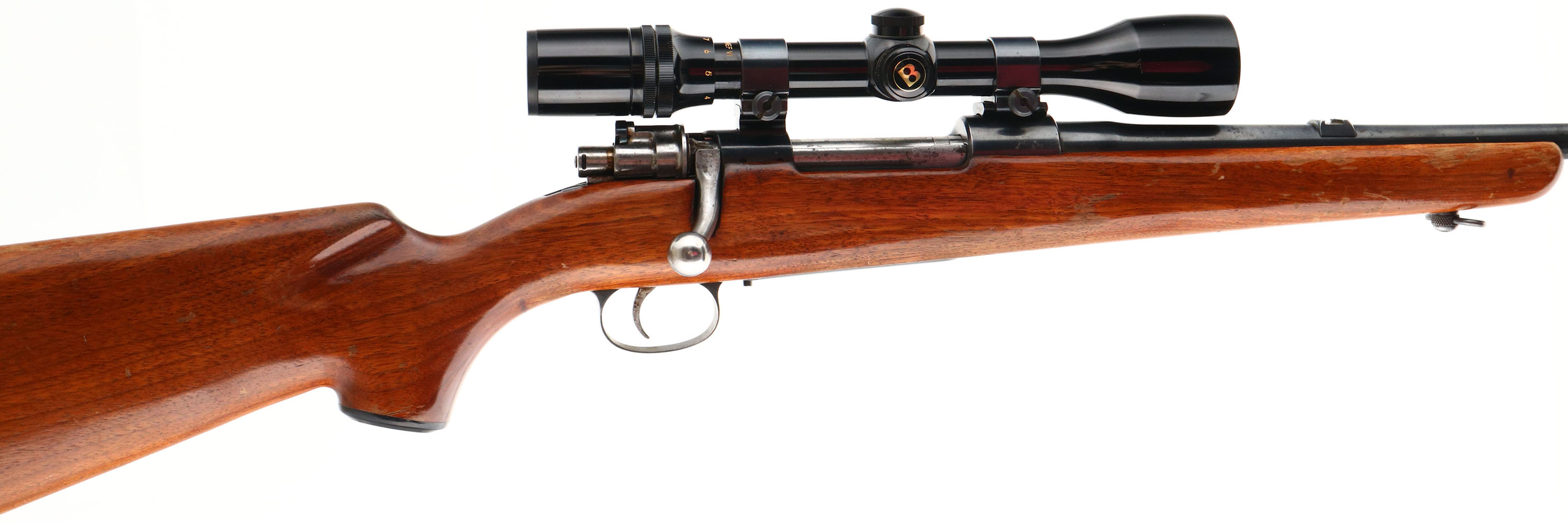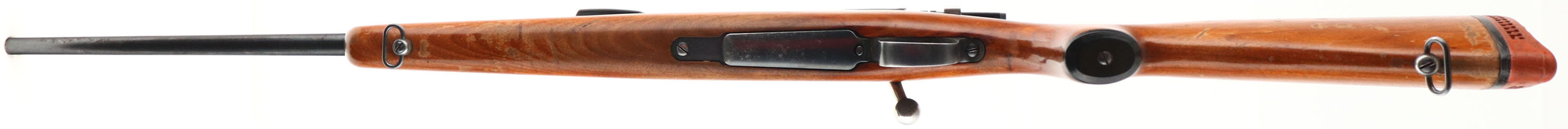 J.C. Higgins, Model 50, CAL: 300 WIN MAG, MFG: 1950's, SN: 12402, Bolt Action Rifle, 22'' barrel. Belgian FN 98 Mauser action & a barrel produced by High Standard for J.C. Higgins. This rifle started out chambered in 30-06, but has been re-chambered to 300 WIN MAG, & original caliber marking has been X'd out & barrel has been properly restamped. The capped pistol grip wood stock is very good, with several small scrapes. scuffs & contusions to the original finish, which is thinning & flaking. The metal blue finish rates 85% overall, with light spotting & additional wear on the floorplate. Bore is very good. The receiver is mounted with a Bushnell Scopechief VI scope on Weaver mounts, while the barrel has an open front & rear dovetails. Buttstock carries a ventilated J.C. Higgins recoil pad, which is a bit proud to the wood. Sling swivels. FFL or C&R Req. - Value: 300 to 600