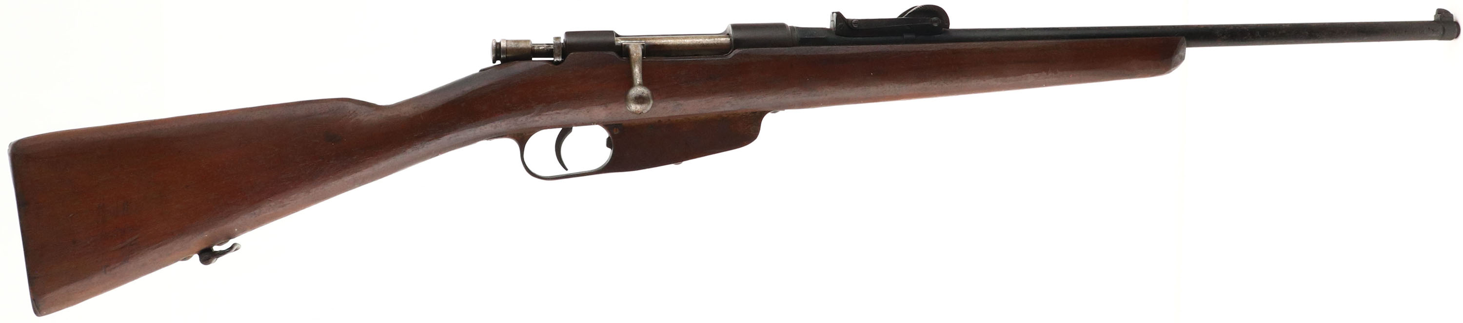 Sporterized Roma Italian 1891 Carcano, CAL: 6.5x52, MFG: 1918, SN: 605, Bolt Action Rifle, 21 3/4'' cutdown barrel. The original cut-down & roughly reshaped wood stock is fair & solid. The stock has a dark brown finish. The barrel appears to be the original, having been shortened. The barrel exterior was rough & pitted, & has a black sprayed finish on it which is peeling & flaking. The metal on the receiver, trigger guard & mag box is brown. The original rear sight has been altered but still has adjustment & there is a banded box blade front sight. Bore is fair. Stock carries a metal buttplate & rear sling loop. A roughly altered military conversion. FFL or C&R Req. - Value: 50 to 100