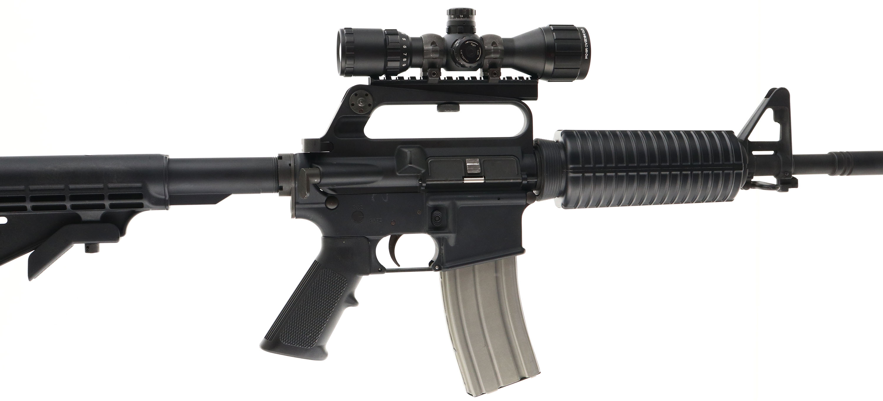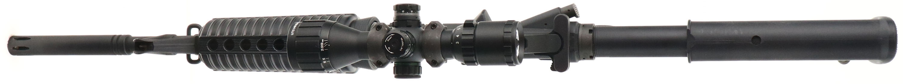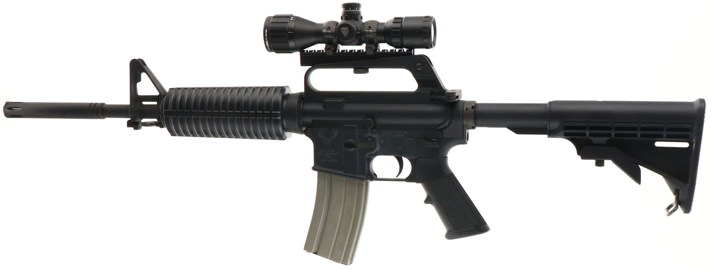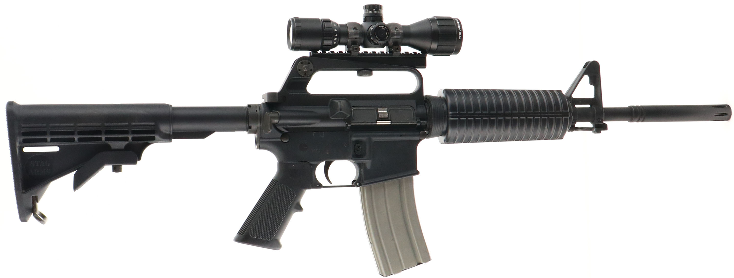 Stag Arms, STAG-15, CAL: 5.56, MFG: Modern, SN: 91407, Semi Auto Pistol, 16 1/2'' barrel. The synthetic checkered grip & Stag 6pt adjustable stock are excellent. The matte black finish rates 95%, with some spotting on the left side of the lower. Bore is excellent. Factory iron sights. The receiver picatinny rail carries a UTG 3-9x32AO Mil-Dot scope. Sling loops. 30rnd steel mag. FFL Req. - Value: 400 to 800