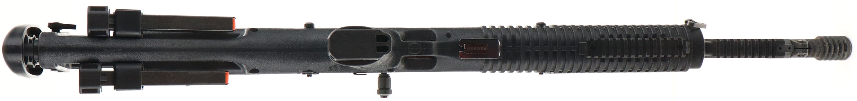 Hi-Point, Model 4595, 45ACP Cal., MFG: Modern, American-made firearm. SN: R50860, Semi auto rifle, 17.5'' barrel, 20'' with muzzle brake. 32'' overall length. The black all-weather molded polymer skeletonized stock & pistol grip, with internal recoil buffer, is excellent. The original black metal finish rates 99%. Bore is excellent, No optics, but a post front sight base & 10'' Picatinny rail for scope or optic mounting. Grip-mounted mag release. Has three 9 round mags, two of which are side of stock mounted. Sling swivels. A compact & rapid fire rifle. FFL Req. - Value: 300 to 500