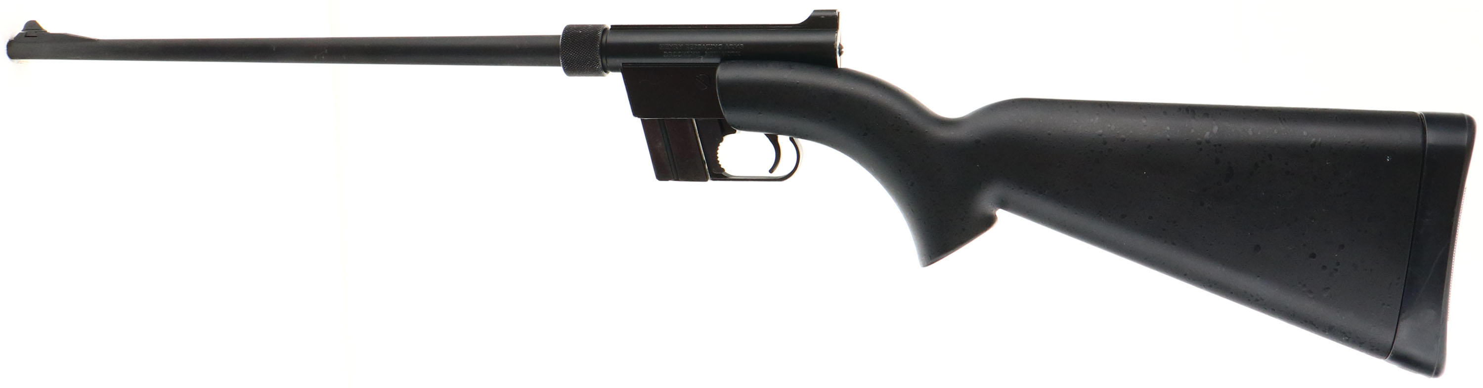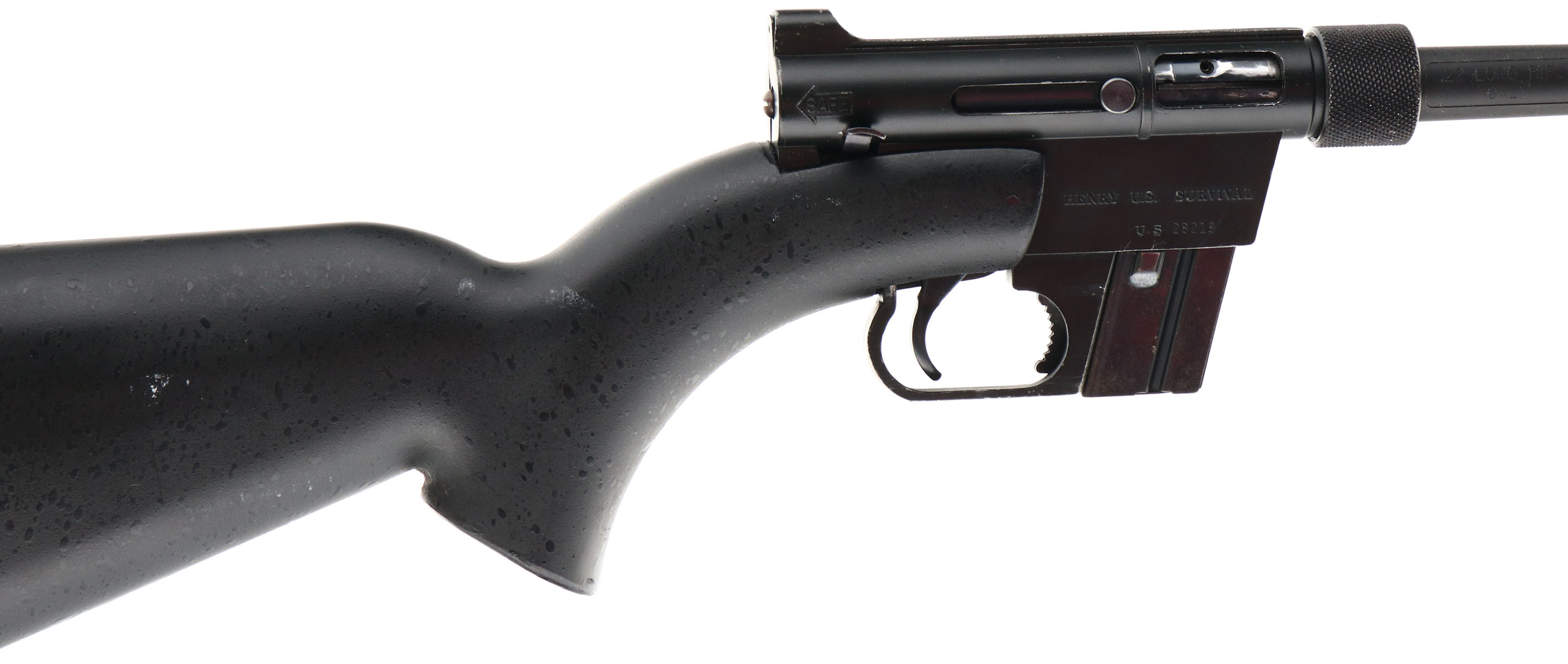 Henry Repeating Arms, Model U.S. Survival Rifle, CAL: 22 LR, MFG: Modern, SN: US28219, Semi Auto Rifle, 16'' barrel. The synthetic matte black stock is excellent, with a few use rubs or light scrapes. When broken down, the stock can contain the action, barrel, & (2) mags. This example only comes with one detachable mag. The matte black finish on the barrel rates 95%, 80% on receiver/ action, & with additional spotty wear to the mag. Bore is excellent. Factory sights. A perfect lightweight backpack / camping gun. FFL Req. - Value: 200 to 300