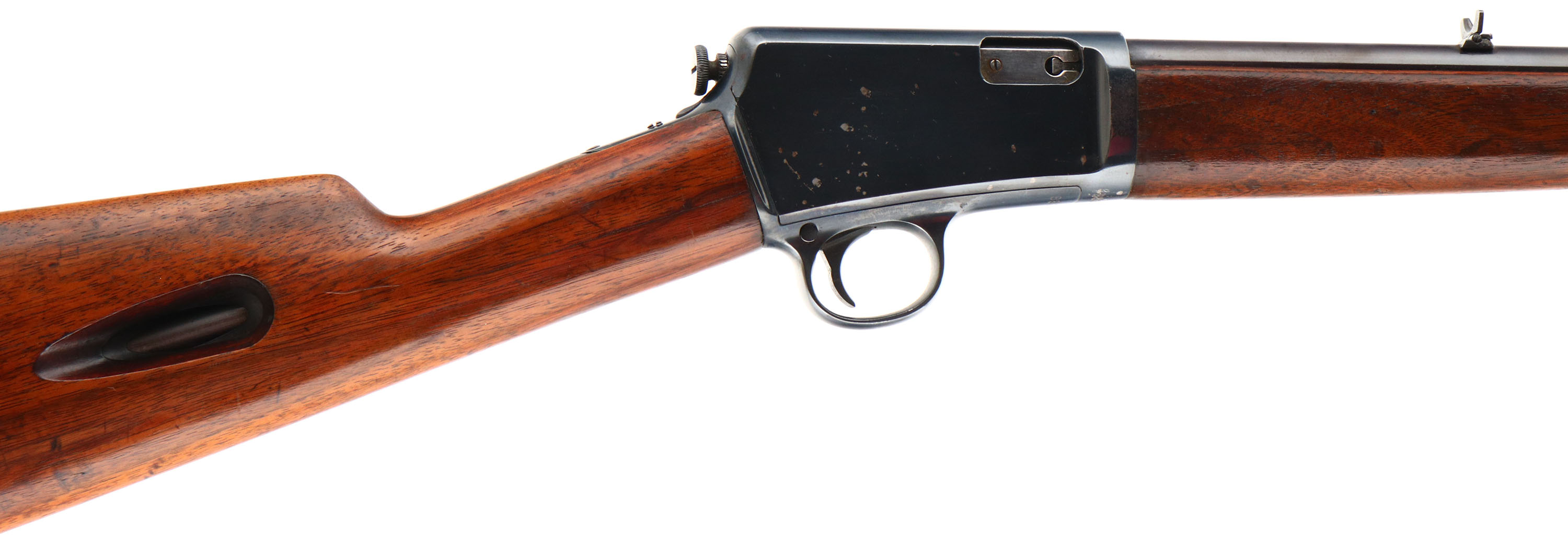 Winchester, Model 1903, .22 WIN AUTO Cal., MFG. 1913, SN: 88336, Semi-Auto Rifle, 20'' round tapered barrel, The original wood stocks are very good & solid, despite several 2'' to 3'' stress cracks to the sides & top of the wrist, as well as two 1'' cracks to the left side of the forend. There is an add layer of finish over the original finish, along with several minor scratches, scrapes & dings. The original metal blue finish rates 90% overall, with some light spotting & pitting on the receiver & the barrel starting to tone plum. Bore is very good. Fitted with a two leaf folding rear sight & original rear sight. Factory metal buttplate. Excellent overall condition. FFL or C&R Req. - Value: 300 to 600