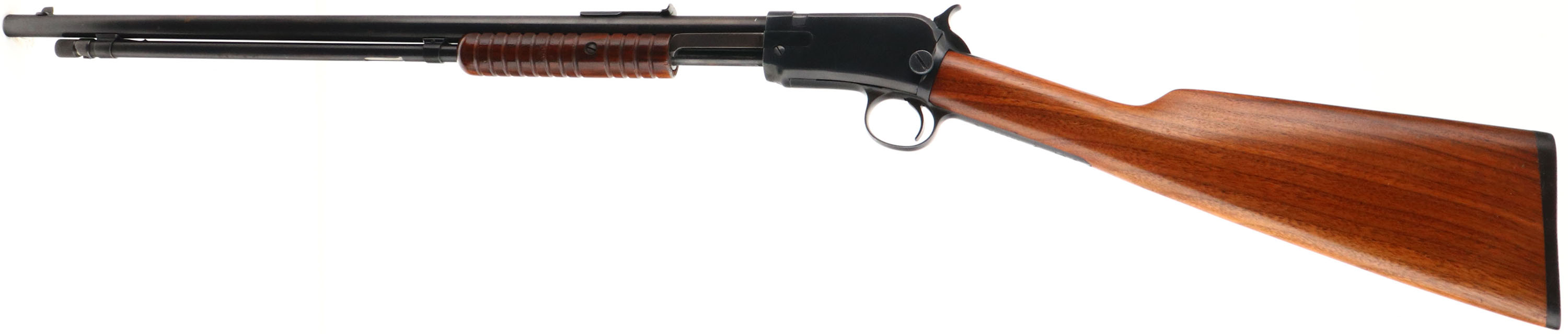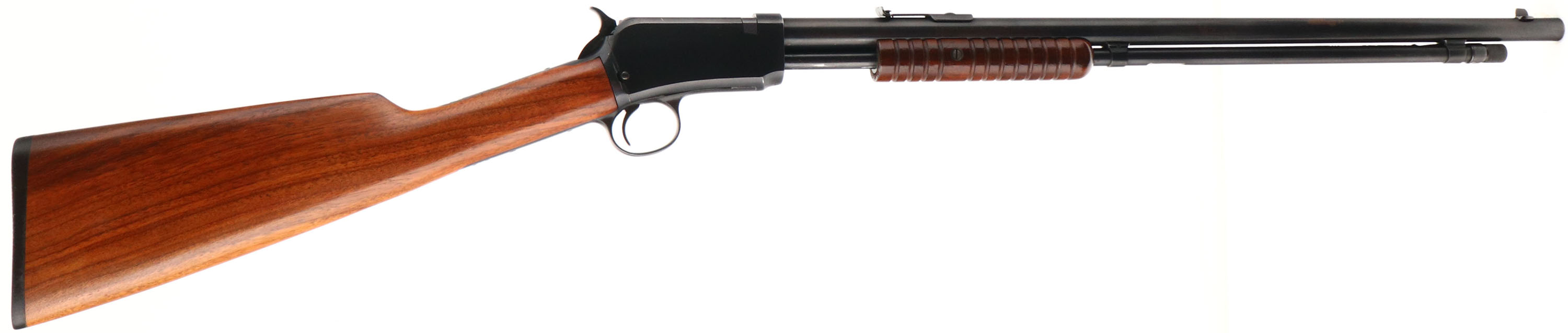 FANTASTIC Winchester, Model 06 , .22 S. L. LR., MFG: 1923, SN: 656731, Pump Action Rifle, 20'' Round barrel, The original straight grip walnut stocks are excellent, with wonderful straight grain. The forearm is of the corn cob style of the model 1890. The original finish is excellent, with virtually no rubs or handling marks. The original metal blue finish on the barrel is 90%, with loss due to a handful of spots of flakey finish loss starting to tone to a thin brown patina. The receiver & mag tube display 98% of the original blue. Bore is excellent. Fitted with standard barrel sights. Winchester plastic buttplate, with engraved screws. A truly excellent, original & collectible condition example. FFL or C&R Req. - Value: 2000 to 3500