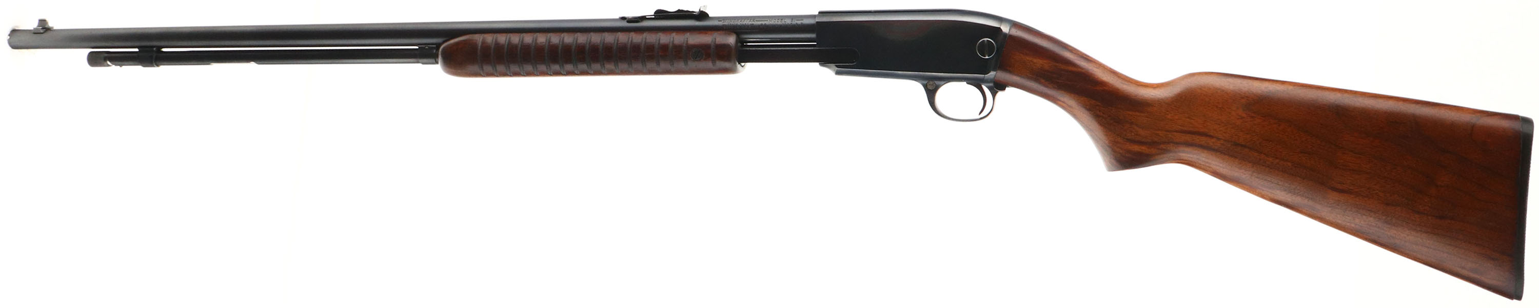 Winchester, Model 61, Marked .22 WIN. MAG. R.F., MFG. 1960, SN: 302347, Pump Action Rifle, 24'' round barrel, Desirable single caliber marking, with .22 Win Mag being the most desirable in the round barrels. The original flat pistol grip wood stocks are excellent, with the original finish & appears to possibly have a thin added layer on the stock. There are very few minor scrapes or handling marks to the finish. Metal is 98%, with visible wear contained mostly at the pump action. Original sights. Factory plastic buttplate. Bore is minty, bright & shiny. Very nice example & highly collectible in this caliber & condition. FFL or C&R Req - Value: 1000 to 2000