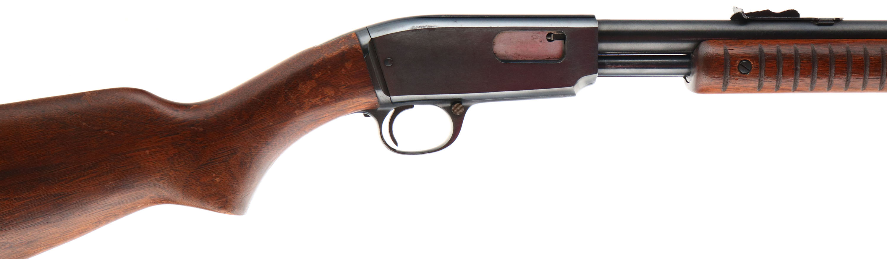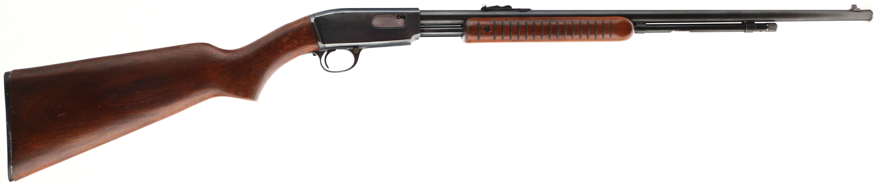 Winchester, Model 61, CAL: 22 S, L & LR, MFG: 1958, SN: 261988, Pump Action Rifle, 24'' barrel. Take-down Rifle. 24'' tapered round barrel. Grooved receiver for potential scope. The factory flat knob pistol grip wood stocks are excellent, retaining most of the original factory finish. There are a number of minor contusions, scrapes & edge nicks. The original metal blue finish rates 95%, with a very small area of rust speckling alone the upper right edge of the receiver. Bore is excellent. Standard open sights. Checkered factory plastic buttplate. Overall, very nice original condition example. FFL or C&R Req. - Value: 700 to 1400