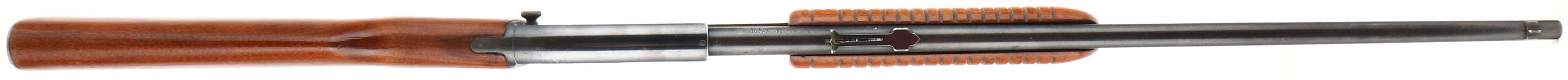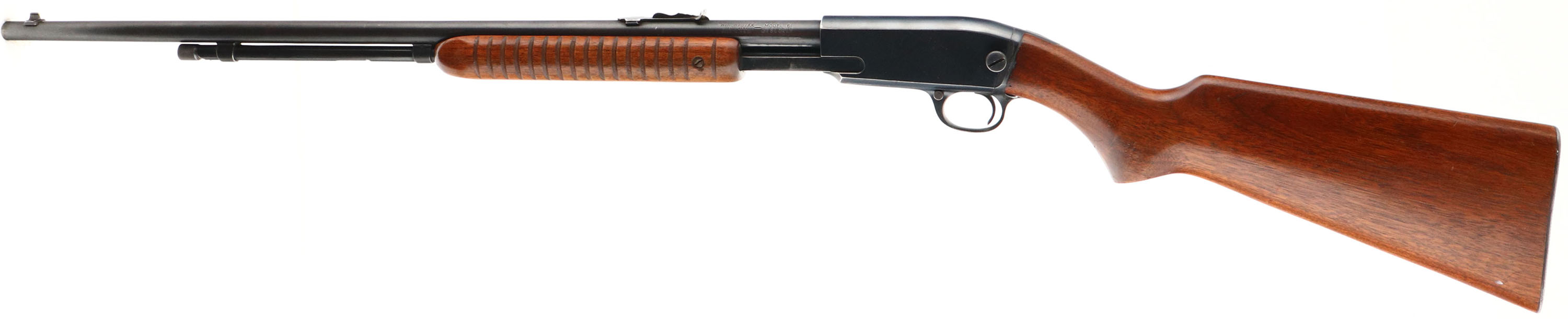 Winchester, Model 61, CAL: .22 S. L. or L.R., MFG: 1952, SN: 184919, Pump Action Rifle, 24'' Round barrel. Smooth top of receiver. The original flat pistol grip wood stock & grooved forend are excellent, with several minor scratches, nicks or contusions to the original finish. The original metal blue finish rates 85% overall. Bore is excellent. The barrel holds the original adjustable rear & small blade front sights. Buttstock carries the earlier checkered metal buttplate. Smooth action. A very nice & original example. FFL or C&R Req. - Value: 500 to 1000