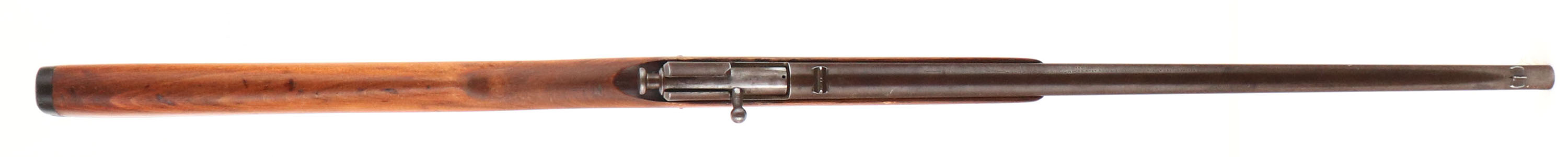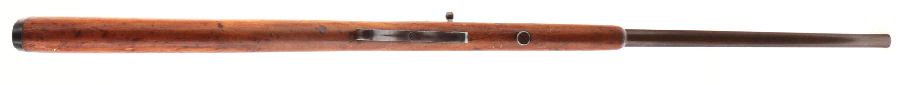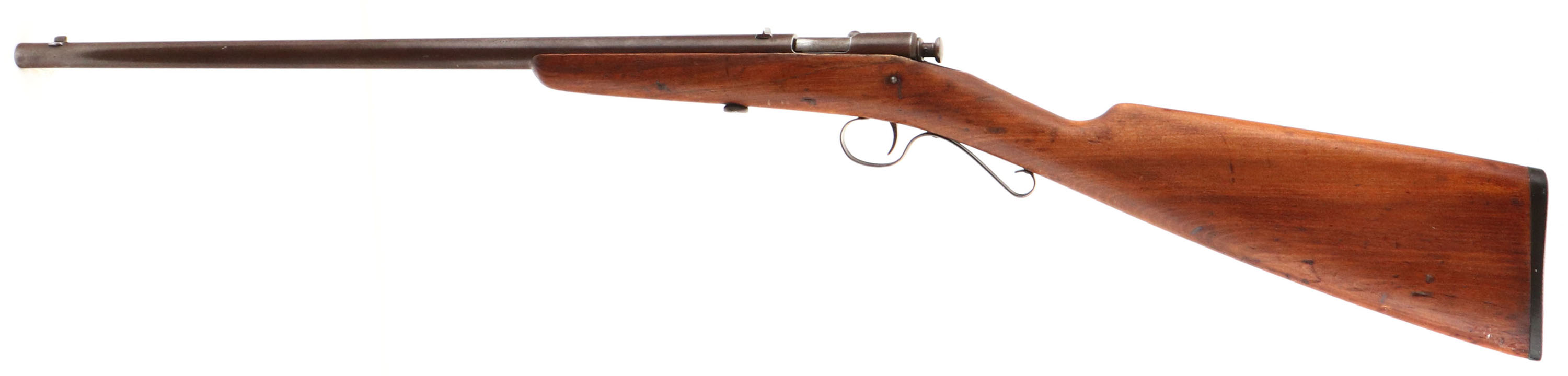 Winchester, Model 1902, CAL: 22 Short, Long & Ex Long, MFG: 1902-31, SN: NSN, Bolt Action Rifle, 18'' barrel. The original straight grip wood stock is very good & solid, but does have a 6'' stress crack repair on the left side of the stock that runs from the below the back end of the receiver up past the take-down screw. The stock was then lightly sanded & nicely refinished, with the remains of minor contusions, scrapes & scratches. The metal finish has worn to a chocolate brown patina. Bore is fair, with roughness & pitting amongst some visible rifling. The barrel holds a factory rear & small blade front sights. Stock carries the original worn hard rubber buttplate, with engraved screws. ''S'' shaped trigger guard. FFL or C&R Req. - Value: 100 to 300