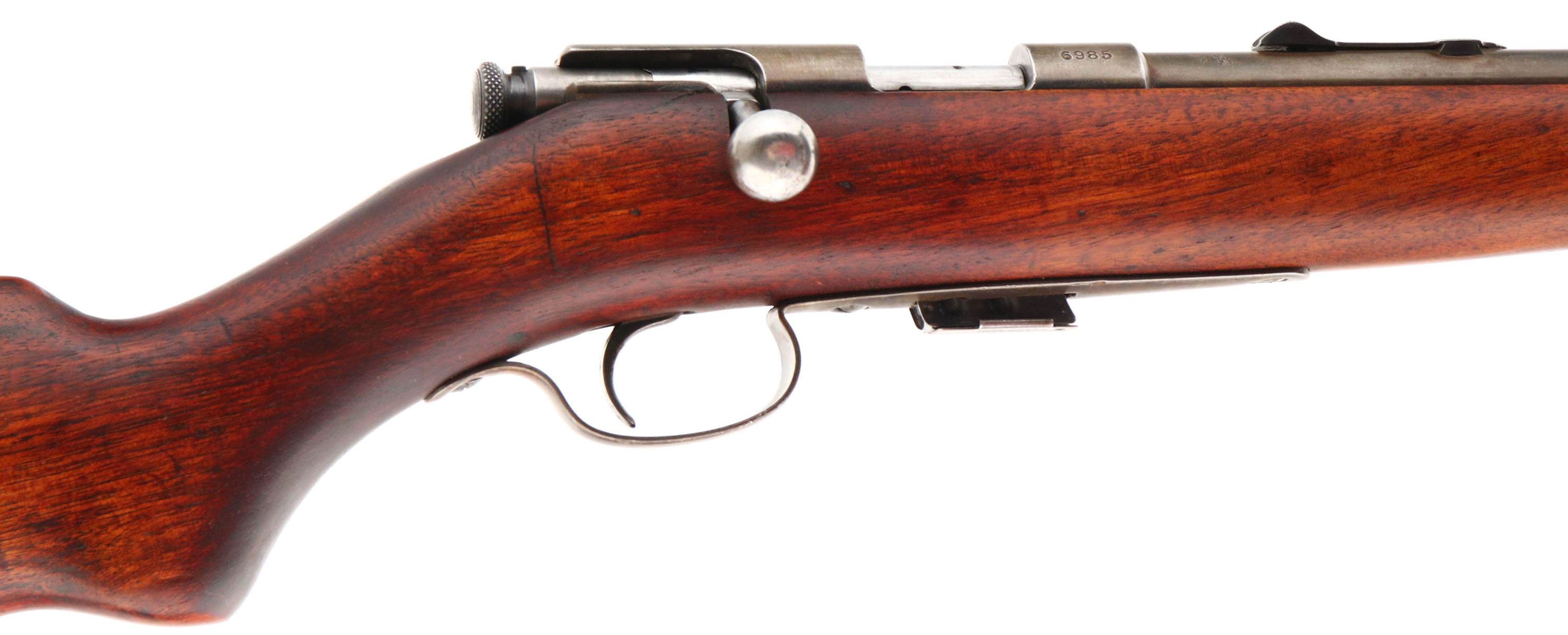 Winchester, Model 56 Sporter, .22 LONG R. Cal., MFG. 1926-29, SN: 6985, Bolt Action Rifle, 22'' Tapered barrel. The original pistol grip wood stock is very good, having been lightly sanded & re-oiled. There minor scrapes, scratches & contusions to the finish. The metal finish rates 50% overall. Bore is very good. The barrel carries a small rear & standard front sight. Checkered metal buttplate. Original ''Winchester'' stamped magazine. Approximately 8,297 were produced over 4 years, but serialized with the model 57 rifles & thus the higher SN than total 56 production. Solid condition & fairly rare model. FFL or C&R Req. - Value: 200 to 400