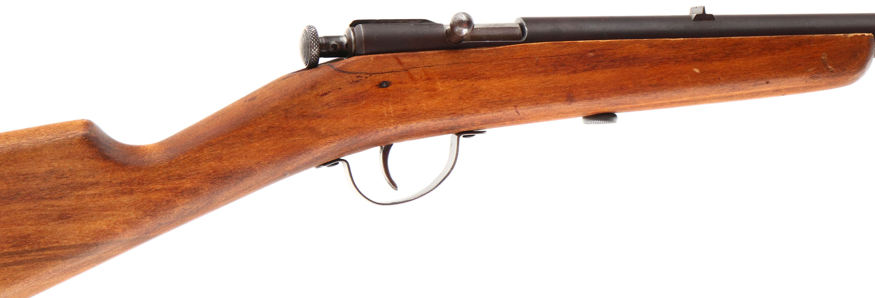Winchester, Model 58, CAL: 22 S,L,LR, MFG: 1928-31, SN: NONE, Bolt Action Rifle, 18'' barrel. This is a fairly rare rifle as only 38,992 were produced during the four years of production. The straight grip wood stock is very good, having been sanded & refinished. There is a 4'' glue repaired stress crack on the right side upper edge under the receiver & a 5'' one on the left side. Nicely repaired before the refinish, with very few handling marks remaining. The metal blue finish has toned to a full coverage brown patina. Bore is excellent. Factory fixed sights. Produced without a buttplate. FFL or C&R Req. - Value: 150 to 300