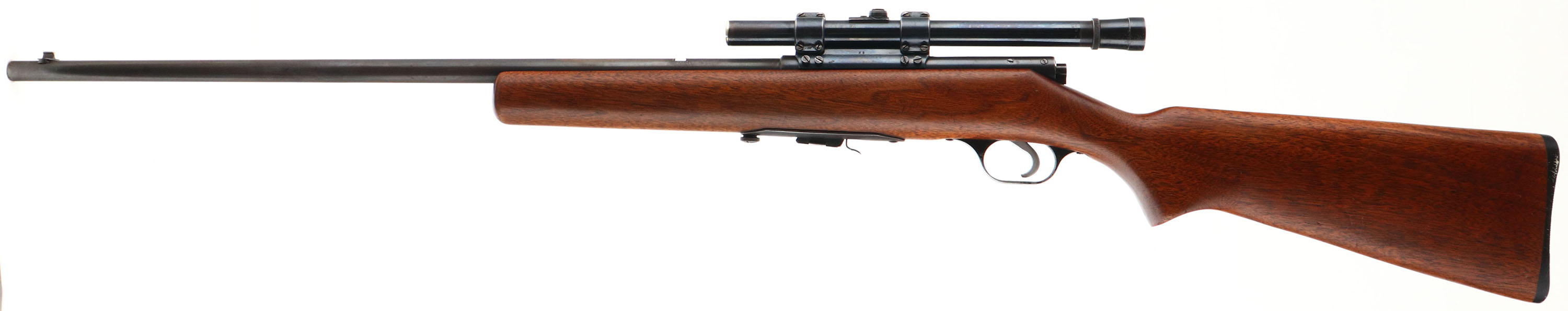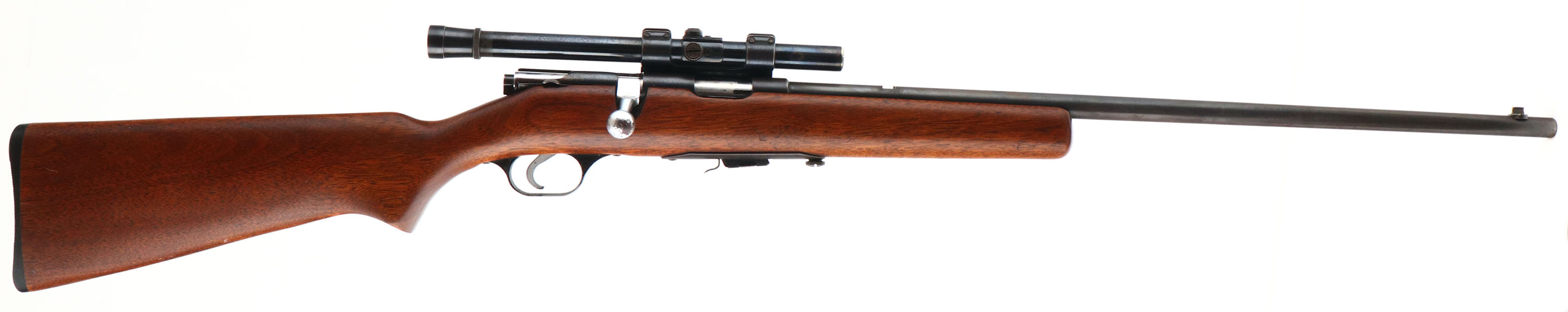 Savage, Model 4C, .22 S, L, LR Cal., MFG. 1933-65, SN: None, Bolt Action Single Shot Rifle, 24'' round barrel. The original flat pistol grip wood stock is excellent, with very few tiny handling scuffs or marks scratches to the excellent finish. The metal blue finish on the barrel rates 80%, 60% on the receiver, toning to a brown patina as it thins. Bore is excellent, Mounted with a Weaver B4 scope, while the barrel has an open rear dovetail & a blade front sight. Original black plastic buttplate. Detachable mag. FFL or C&R Req. - Value: 200 to 400