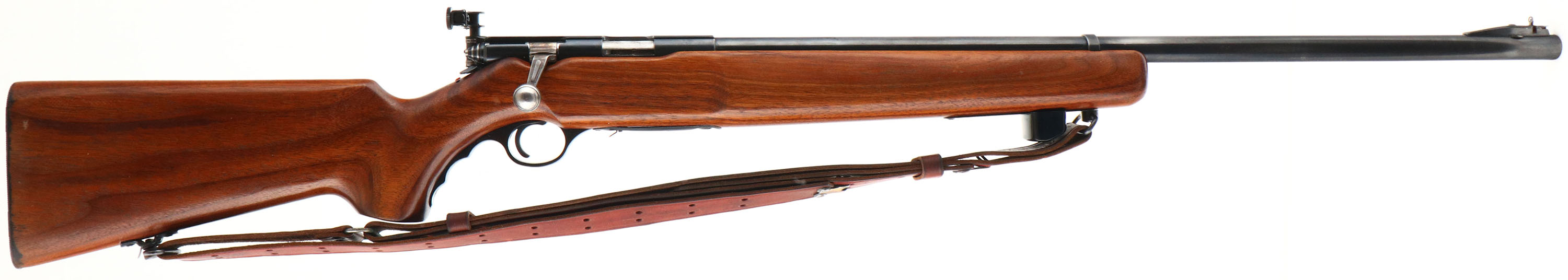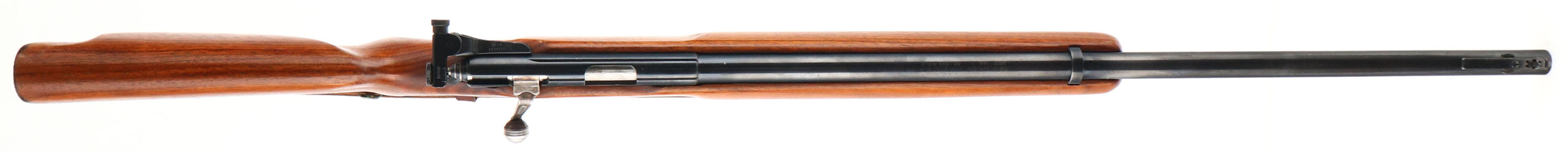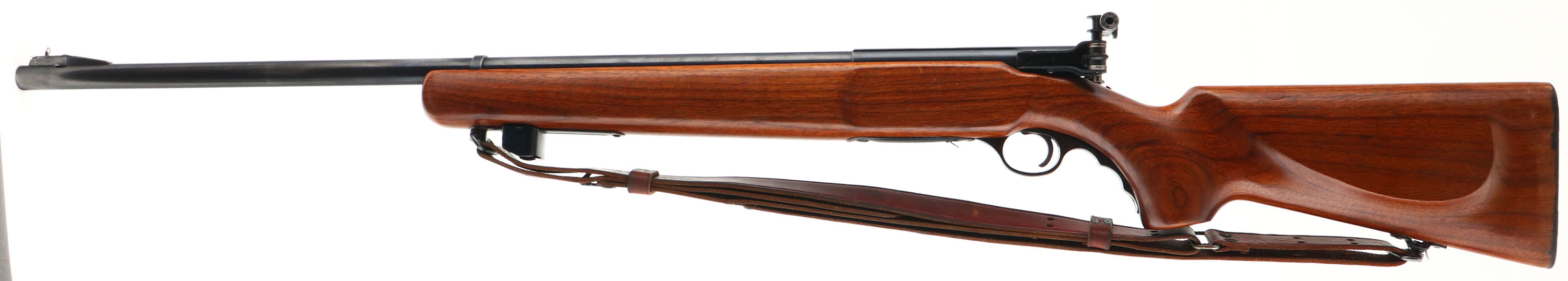 O.F Mossberg & Sons Model 144, CAL: 22 LR., MFG: 1950-85, SN: NONE, Bolt Action Rifle, 26'' Round barrel. The factory cheeked, flat knob, finger & grooved pistol grip wood stock is excellent, with minor handling marks to the excellent original finish. There is some staining on the buttend edge due to moisture damage. The original metal blue finish rates 90% overall. Bore is excellent. Fitted with a multi adjusting Mossberg S-130 receiver sight & ramped muti blade option front sight. Buttstock carries a grooved metal buttplate. The stock also has a finger grooved plastic trigger guard. Sling swivels hold a period correct leather sling. Missing the detachable mag. A solid & very nice bolt .22 rifle. FFL or C&R REQ - Value: 250 to 500