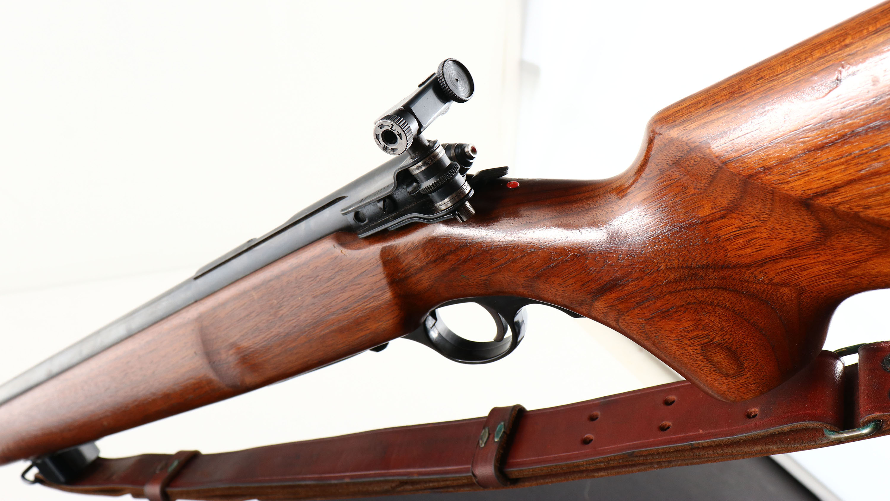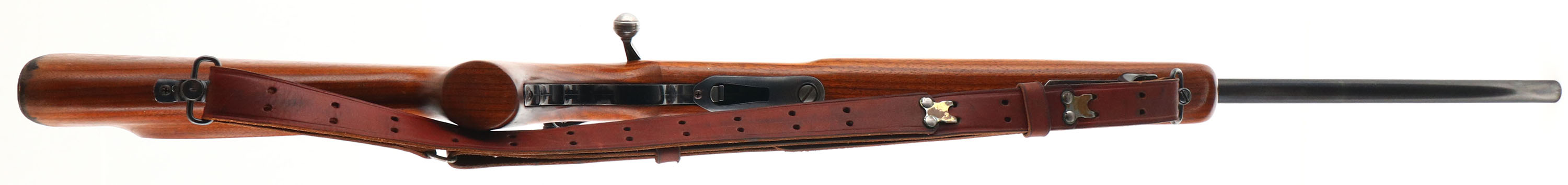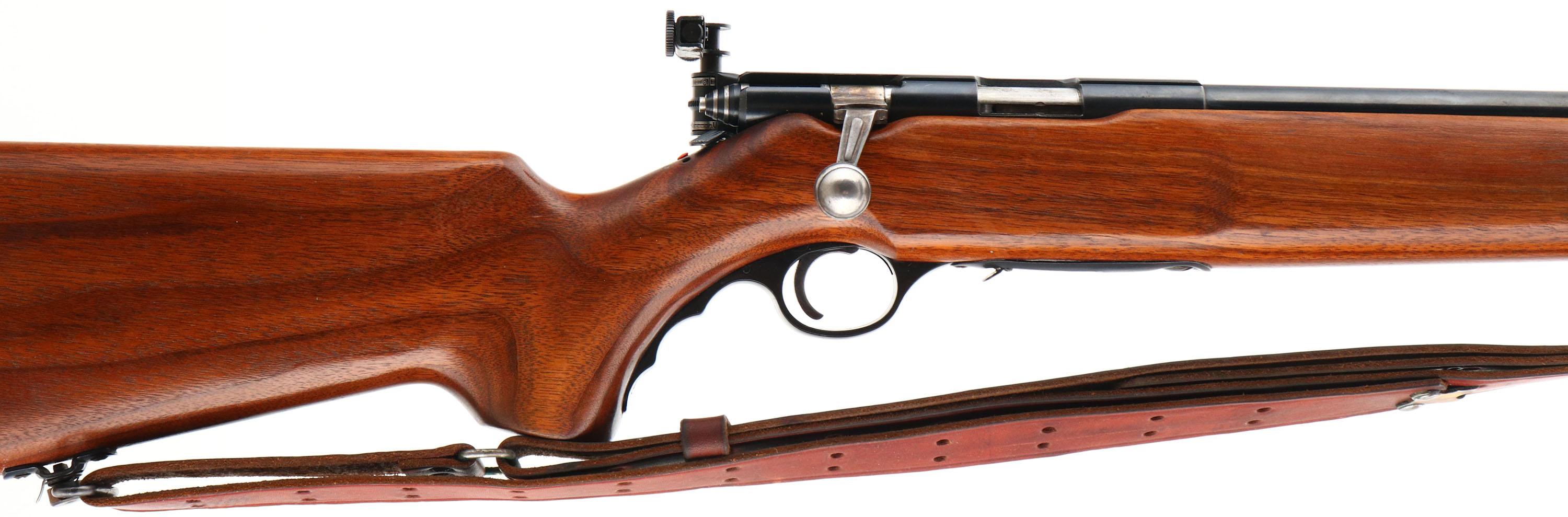O.F Mossberg & Sons Model 144, CAL: 22 LR., MFG: 1950-85, SN: NONE, Bolt Action Rifle, 26'' Round barrel. The factory cheeked, flat knob, finger & grooved pistol grip wood stock is excellent, with minor handling marks to the excellent original finish. There is some staining on the buttend edge due to moisture damage. The original metal blue finish rates 90% overall. Bore is excellent. Fitted with a multi adjusting Mossberg S-130 receiver sight & ramped muti blade option front sight. Buttstock carries a grooved metal buttplate. The stock also has a finger grooved plastic trigger guard. Sling swivels hold a period correct leather sling. Missing the detachable mag. A solid & very nice bolt .22 rifle. FFL or C&R REQ - Value: 250 to 500