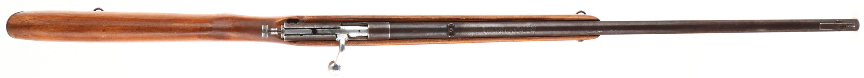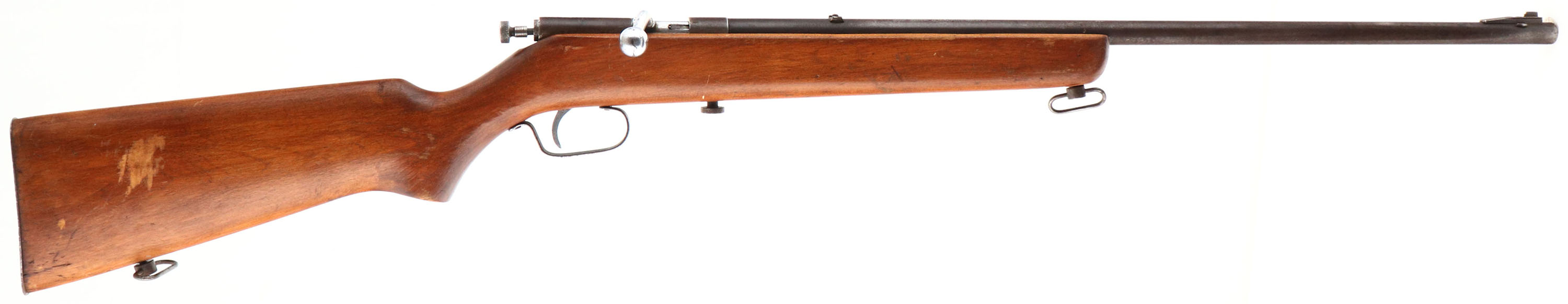 O.F. Mossberg & Sons Inc., Model 25, Cal: .22 S.L.LR, MFG: 1935-36, S/N: None, Bolt action rifle, 24'' barrel. The flat pistol grip wood stock is good, with scratches, scrapes, dings & wear to a previous sanding & refinish. There is a larger area of scrapes on the right side of the stock. The flat metal buttplate is slightly proud to the wood at the toe & the heel. The metal surfaces have mostly toned to a brown patina, with rust speckling. The bore is excellent. The barrel holds a blade front sight, with no rear sight. The stock carries a steel buttplate. Sling swivels. FFL or C&R Req. - Value: 50 to 150