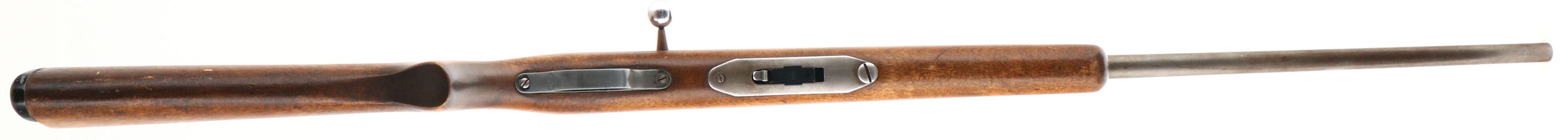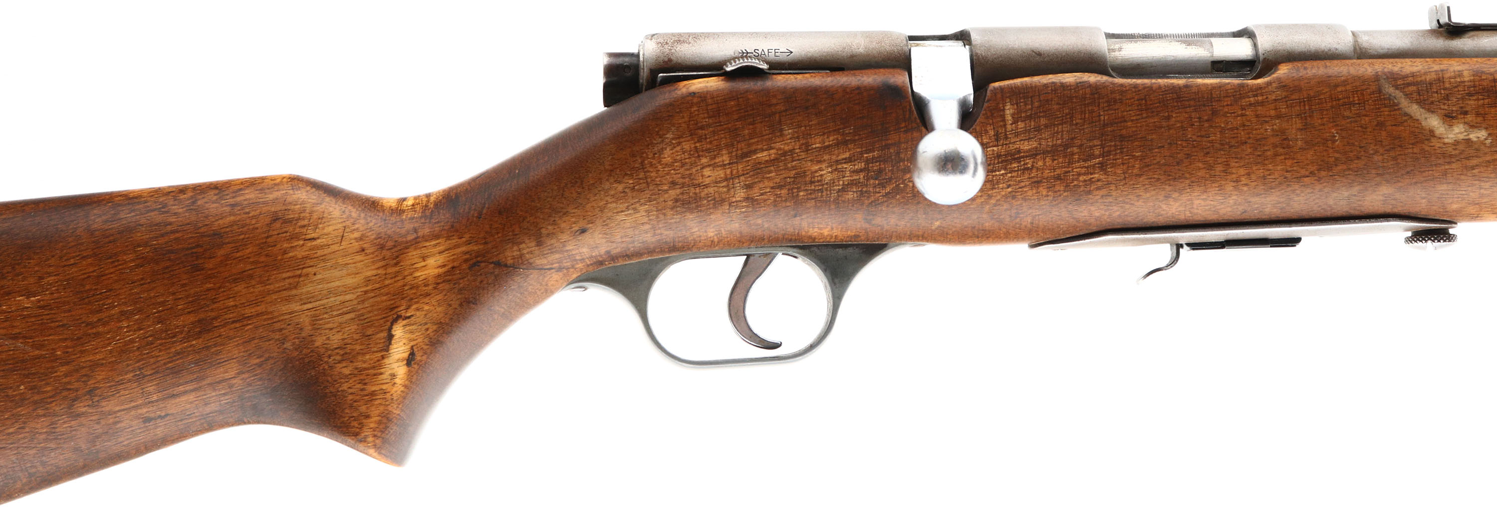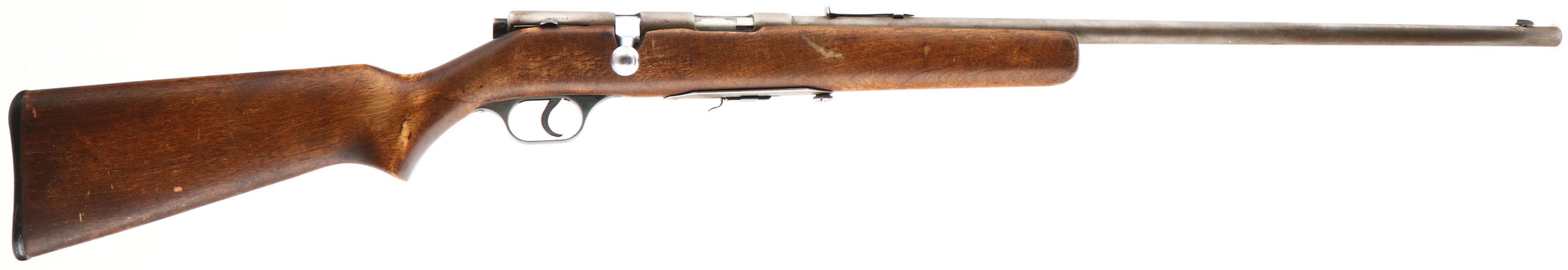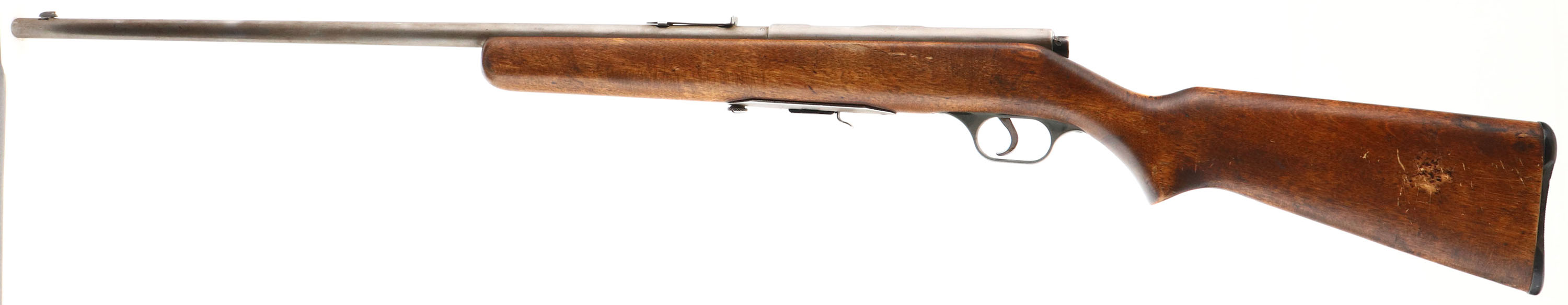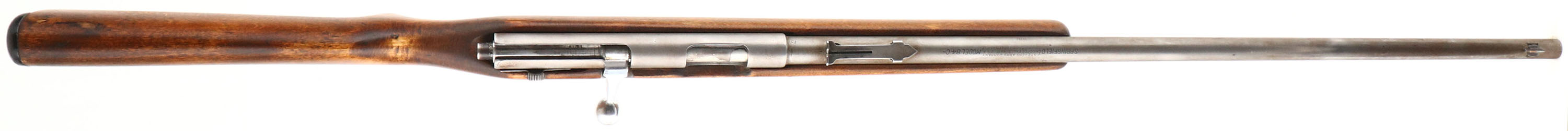 Springfield (J.Stevens Arms Co.), Model: 84C, Cal: .22 S.L.LR, MFG: 1938-60, S/N: None, Bolt action rifle, 24'' barrel. The flat pistol grip wood stock is very good & solid, as being sanded & re-finished. Stock also has some light scratches & handling marks remaining. The metal finish has completely worn gray, with some line remains of brown patina. Nickel finish on bolt. The bore is very good. The barrel holds a standard rear sight without the riser & an updated Marble Sheard blade front sight. The stock carries a grooved plastic buttplate, which is a bit oversized & has a large edge chip on the left side. Detachable mag. FFL or C&R Req. - Value: 50 to 150