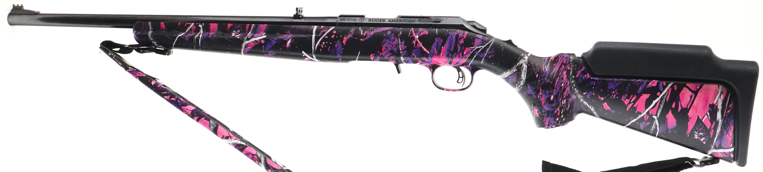 BOXED Ruger Model American (RF-C-CamGP), Talo Exclusive, CAL: 22 LR, MFG: Modern, SN: 832-91538, Bolt Action Rifle, 18'' barrel. The original capped pistol grip composite stock is excellent, with the ''Muddy Girl Camo'' pattern. The original satin blue finish is excellent. Bore is excellent. The barrel holds original folding leaf rear & fiber optic ramped front sights. Stock has a Ruger solid black rubber recoil pad. Sling loops present. 10 round detachable mag. Comes in the factory box, with booklet & sling. FFL Req. - Value: 200 to 400