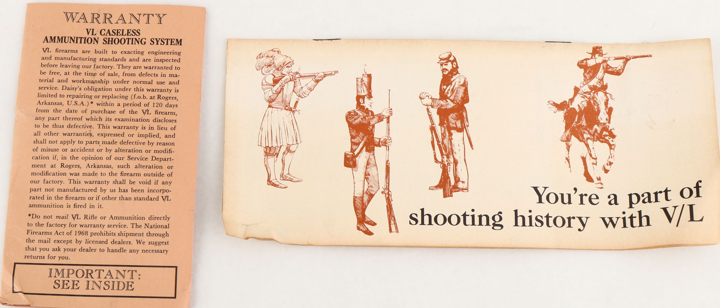 BOXED, Daisy & Heddon, VL Rifle, CAL: .22 Cal. Caseless VL Ammo, S/N: A034639, 18'' barrel. The original checkered & capped pistol grip wood grain plastic stock, with ebony toned forend tip, is excellent. The original metal blue finish rates 99%+ overall. Bore is excellent. The barrel holds an adjustable rear sight & ramp elevated blade front sight. Stock carries a VL grooved plastic buttplate. Comes in the original box, with internal packaging, a booklet & warranty card. FFL Req. - Value: 300 to 600