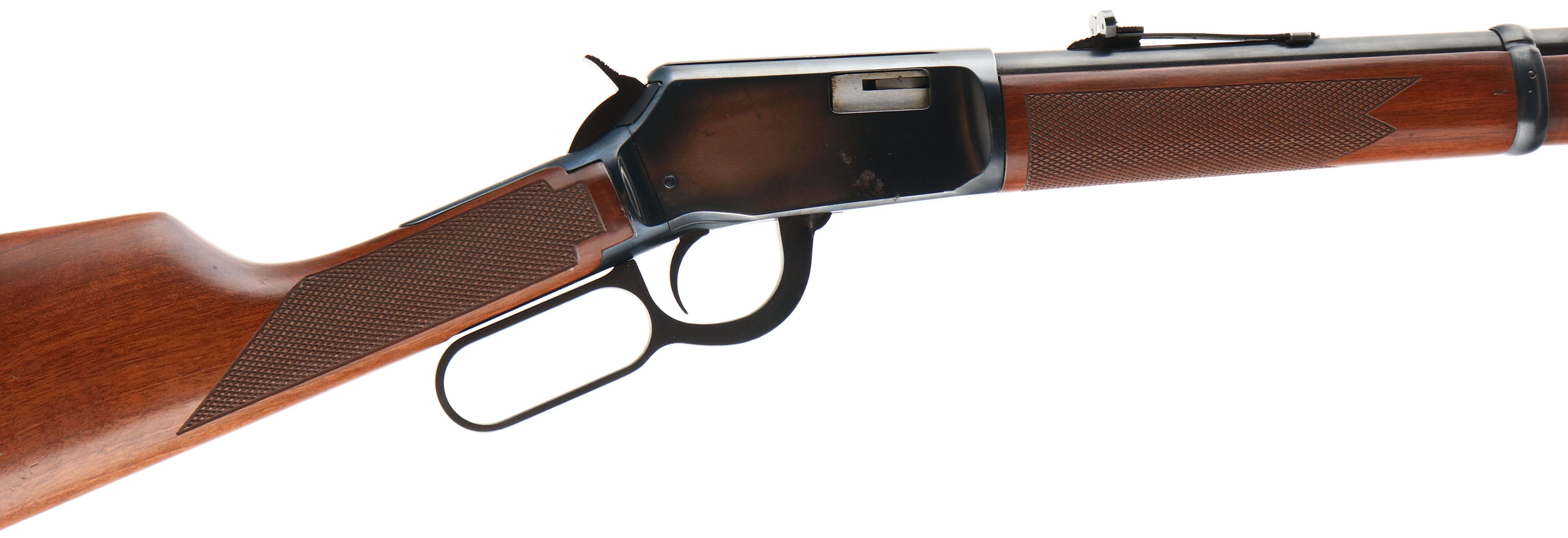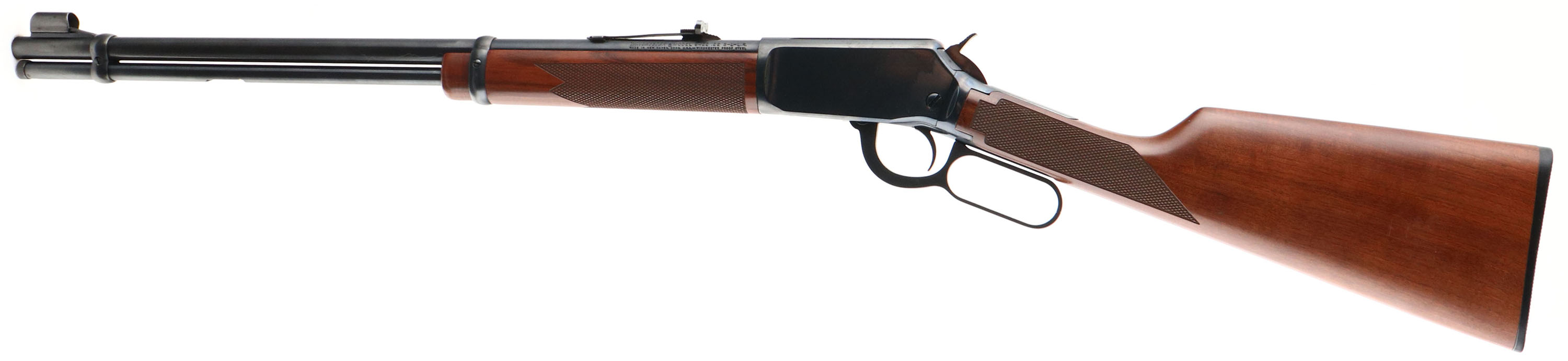 Winchester Model 9422 WIN Magnum, CAL: .22 S, L, LR, MFG: Modern, SN: F610004, Lever Action Rifle, 20 1/4'' barrel. Grooved receiver. The original Checkered & straight grip wood stocks are excellent, displaying factory finish & very few tiny handling marks. The original metal blue finish rates 98% overall, but with a few small spots of cleaned pitting on the right side of the receiver. Barrel holds an adjustable rear elevator sight & large hood front sight. Bore is excellent. Buttstock carries a factory Winchester, checkered, black plastic buttplate. An excellent overall rifle. FFL Req. - Value: 600 to 1000