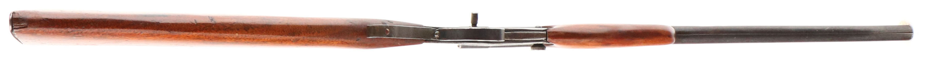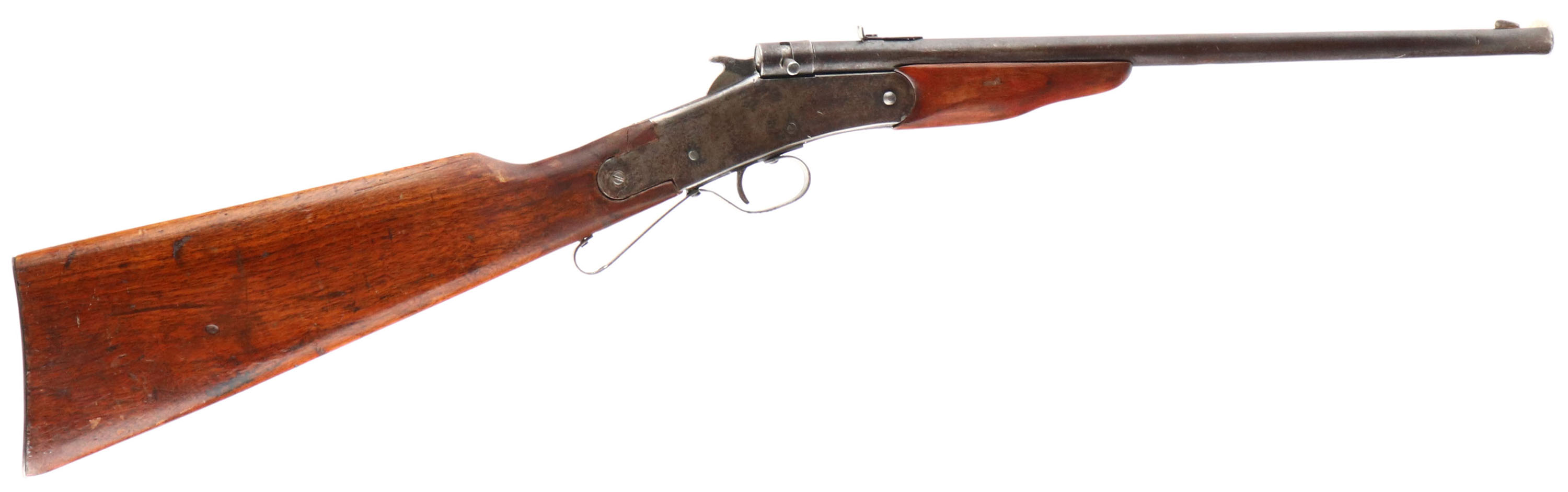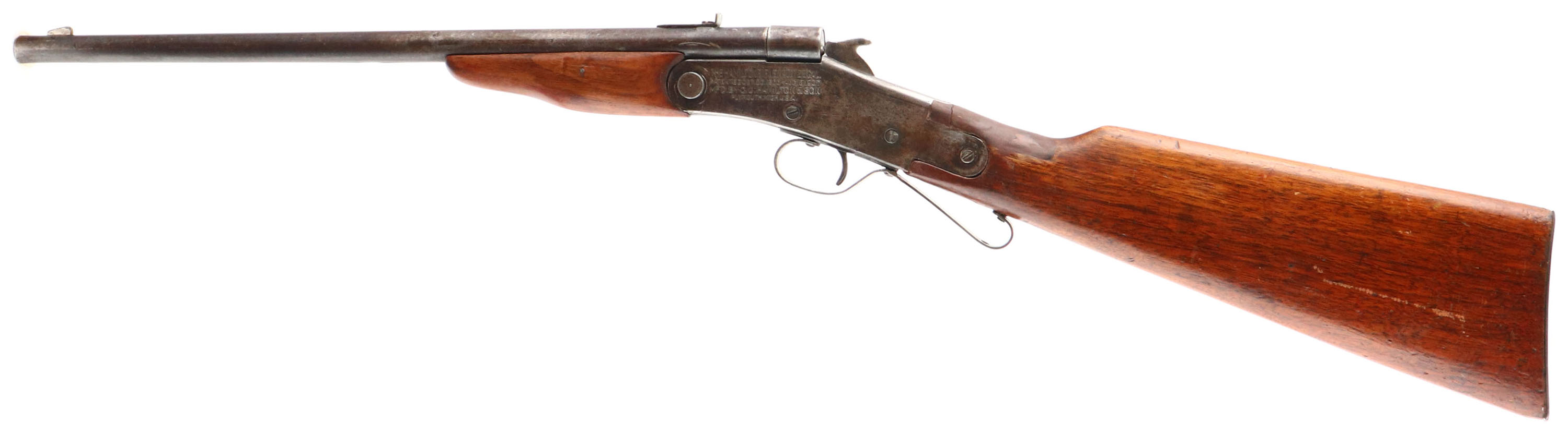 C.J. Hamilton & Son, The Hamilton Rifle Model 027 (USA produced version), .22 LR, MFG 1908-30, SN: None, Break single shot rifle. 15'' Round barrel. The model 027 was considered the more expensive version of the model 27, as they carried an oval shaped stock made of walnut rather than a flat birch board. Early examples had the same brass barrel liner, which was later changed to a steel liner. The factory walnut wood stocks on this example are fine & solid, despite having a brake repair at the wrist requiring some filler & a couple of stress cracks at the wrist. The stocks have been sanded & refinished. The stocks show some staining & other minor scuffs or handling marks. The original metal blue finish has worn & toned to gun metal gray & a spotty brown patina, with some speckling & nick or abrasions. Steel rolled barrel over brass bore liner, 6 groove bore with 1 turn in 15''. The brass bore is good, with lots of rifling remaining. Barrel carries original open iron sights. Thin metal buttplate. A fairly rare Hamilton single shot rifle. FFL or C&R Req. - Value: 80 to 150