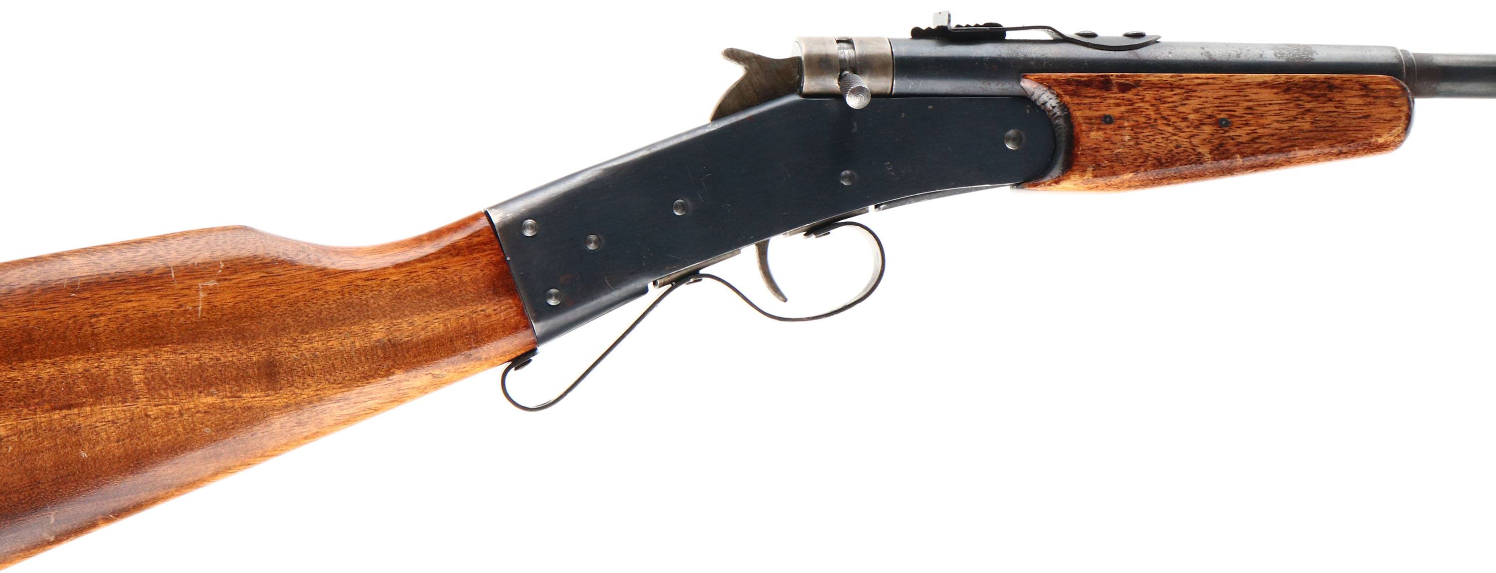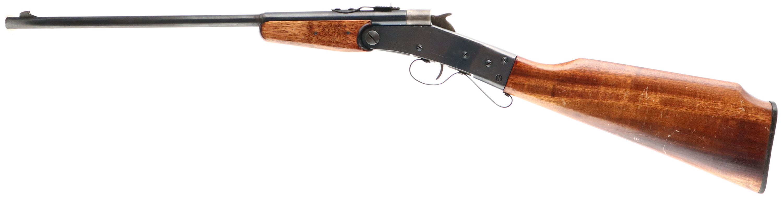 Sierra Arms Co., A Japanese version of the Hamilton Rifle (Model 027), .22 LR, MFG 1965, SN: 003827, Break single shot rifle. 17.5'' Round barrel. A California import companies version of the Hamilton model 027 from Japan. They were not very successful as many dealers thought they were too cheaply made to withstand the .22 LR caliber they marketed to fire. They closely resembled the Hamilton 027, but they carried a walnut stained Monte Carlo shaped stock, had a longer step-down barrel & were fitted with an adjustable rear sight & more substantial front sight. The action remained the same, as did the brass barrel liner. The stocks on this example are very good & solid, with an added layer of finish over the original finish. The stocks display minor scuffs, scrapes or handling marks. The original metal blue finish rates 85 on the receiver, 70% on the barrel, with some rust patina on the barrel where flaking. Bore is good. Barrel carries original sights. Black rubber buttplate. FFL or C&R Req. - Value: 50 to 200