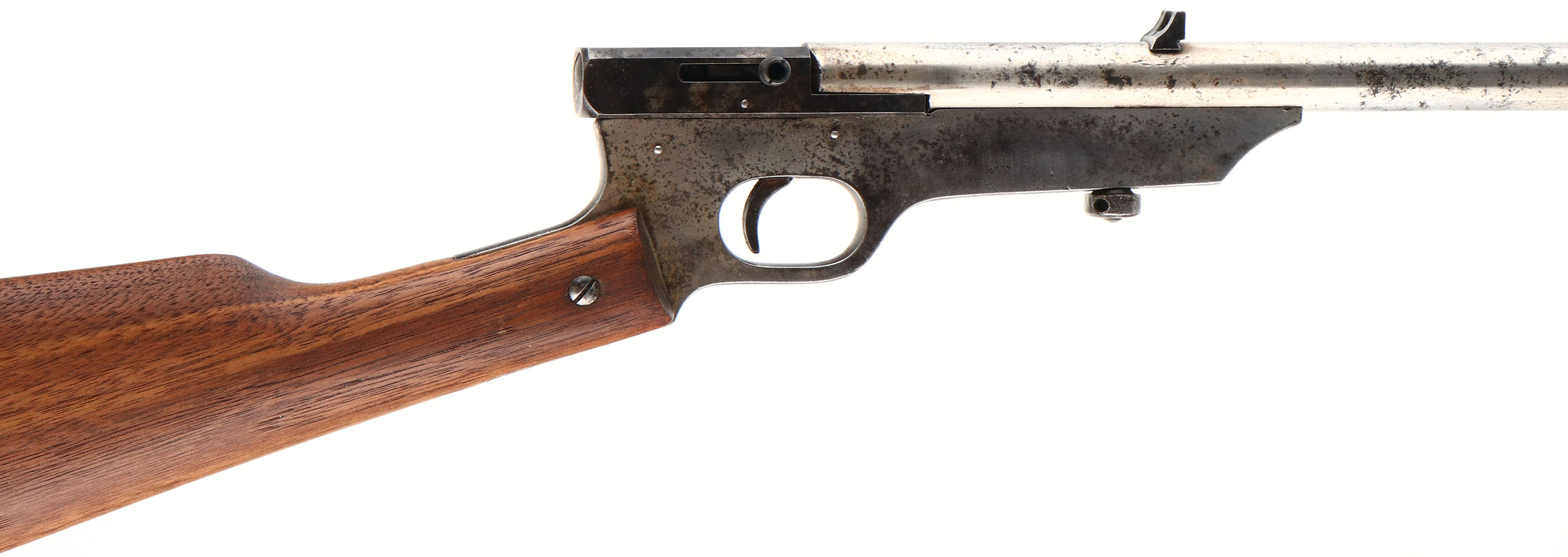 H.M Quackenbush, Safety Cartridge, CAL: 22 S,L,LR, MFG: 1890-1908, SN: NONE, Swing Gate Single Shot Rifle, 18'' barrel. The Safety Cartridge rifle started production in 1896 to around 1920, but a wood forearm was added in 1908. This is the earlier version without the wood forearm. The original straight grip wood stock is excellent & solid, having been sanded & nicely refinished. The metal surfaces have been buffed & polish due to rust pitting, but there remains a mix of original nickel, polished steel & spotty areas of cleaned black pitting. Bore is poor, dark & rough. Fixed rear sight (mounted backwards) & small blade front sight. Original early swiss style metal buttplate, with remnants of nickel finish. FFL or C&R Req. - Value: 100 to 200