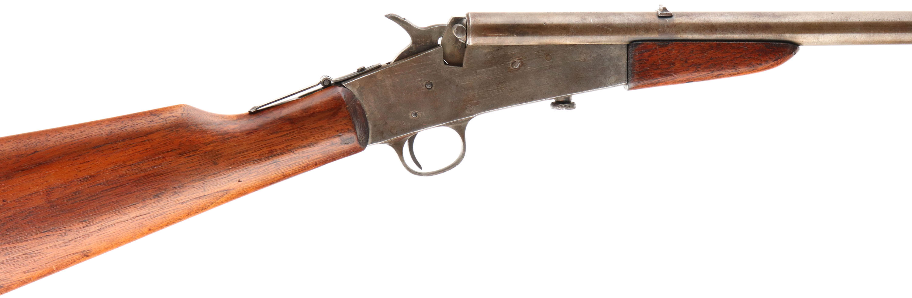 Remington, Model 6, CAL: .22 S,L,LR, MFG: 1901-33, SN: 368466 (barrel), Single Shot Falling Block Rifle, 20'' barrel. The straight grip wood stocks are very good & solid, with an added layer of finish over the original worn finish. There are light scratches, scrapes & contusions, along with a short hairline crack coming off the lower tang. Matching SN on stock. The metal blue finish on the barrel has worn to metal gray, with a thin brown patina. The case-hardened receiver has worn to metal gray & toned to a thin brown patina. Bore is fair & with consistent scarring & pitting amongst worn rifling, Fixed rear sight, blade front sight & flip-up tang peep sight. Remington-UMC smooth metal buttplate. FFL or C&R Req. - Value: 100 to 200