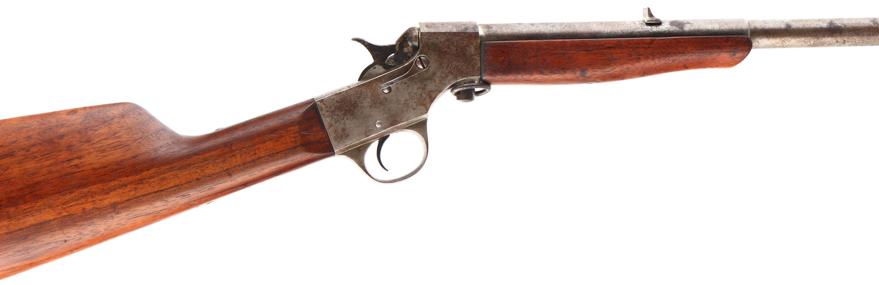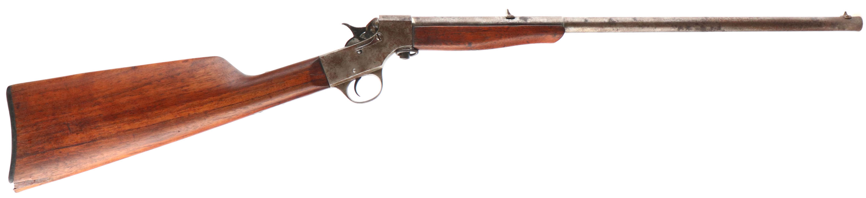 Marvel (Stevens), Model The .22 Marvel, CAL: 22 LR, MFG: N/A, SN: T283, Single Shot Rolling Block Rifle, 20'' barrel. The straight grip wood stock is good & solid, having been lightly sanded & refinished. There is a large edge chip fill repair at the toe & small cracks on the right/left side near the heel, along with some smoothed contusions & scrapes. The metal blue finish has entirely worn to metal gray, with spotted brown patina. Bore is fair, with scarring & pitting. Fixed notch rear sight & blade front sight. Checkered plastic buttplate, with large missing chip at the toe. FFL or C&R Req. - Value: 70 to 150