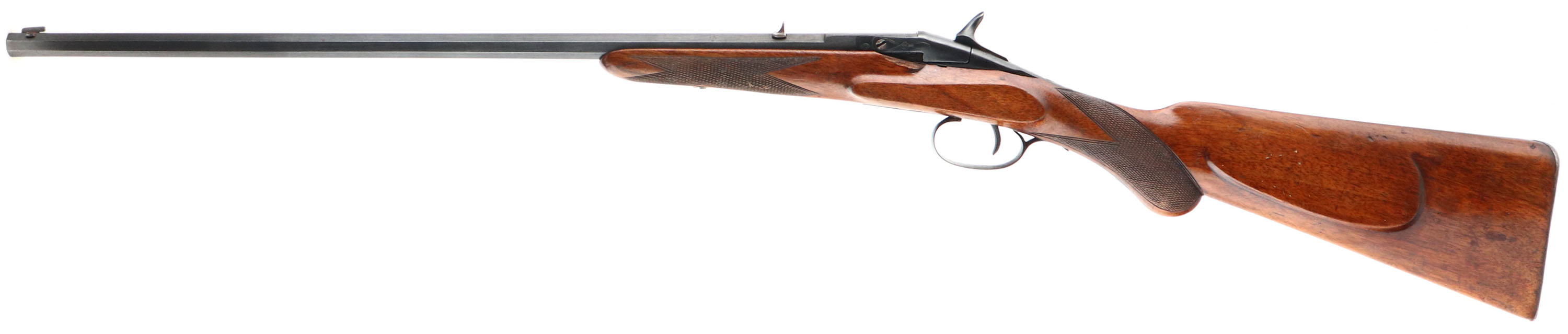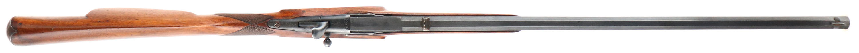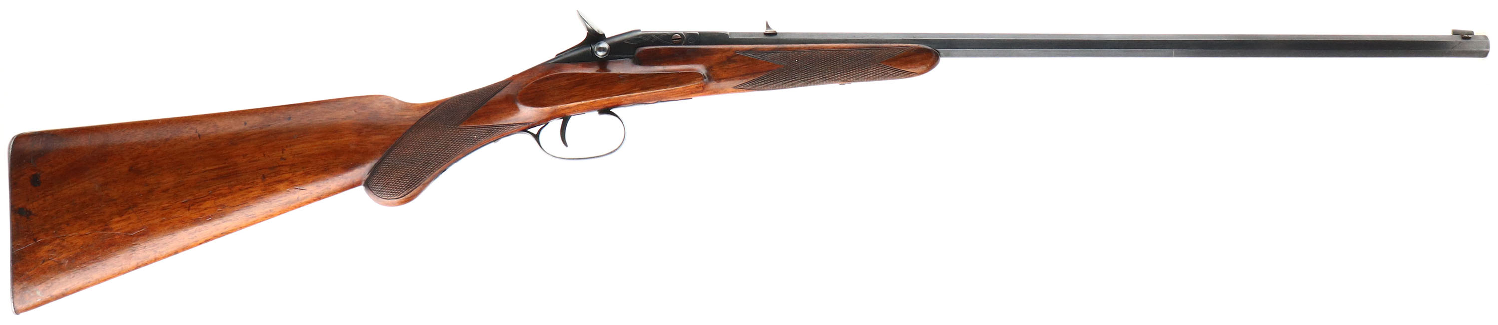 Flobert, Parlor Rifle, CAL: .22, MFG: Pre 1899 Antique, SN: NONE, Single Shot Rifle, 23 1/2'' smoothbore barrel. The checkered & round pistol grip wood stock is very good & solid, having a thin added layer of finish over the original. There are two edge chips at the left side of the receiver, along with minor contusions & scratches. The metal reblued finish has 90% coverage, with areas of rust speckling. Light decorative engraving on receiver & trigger guard. Bore is fair, but with areas of cleaned pitting. Fixed rear sight & blade front sight. Unique lift pivot extractor. Widow's peak smooth metal buttplate. Antique, No FFL Req. - Value: 100 to 250