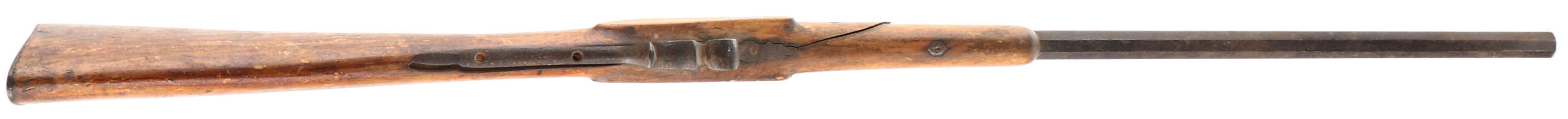Flobert, Thumb Extractor Parlor Rifle, CAL: .22, MFG: 1880's-90's, SN: NONE, Single Shot Rifle, 22'' smoothbore barrel. The original straight grip wood stock is poor, having a large crack/brake on the left side of forend. There are numerous contusions & scratches, with most of the finish worn away. The metal surfaces are covered in rust & pitting. Bore is fair, consistently rough with areas of pitting. Fixed rear sight & small bead front sight. Widow's peak smooth metal buttplate. Missing the three stock retention screws in the upper & lower tangs. This is a project gun in need of restoration. It is therefore being sold ''AS-IS'' with no returns. Antique, No FFL Req. - Value: 20 to 80