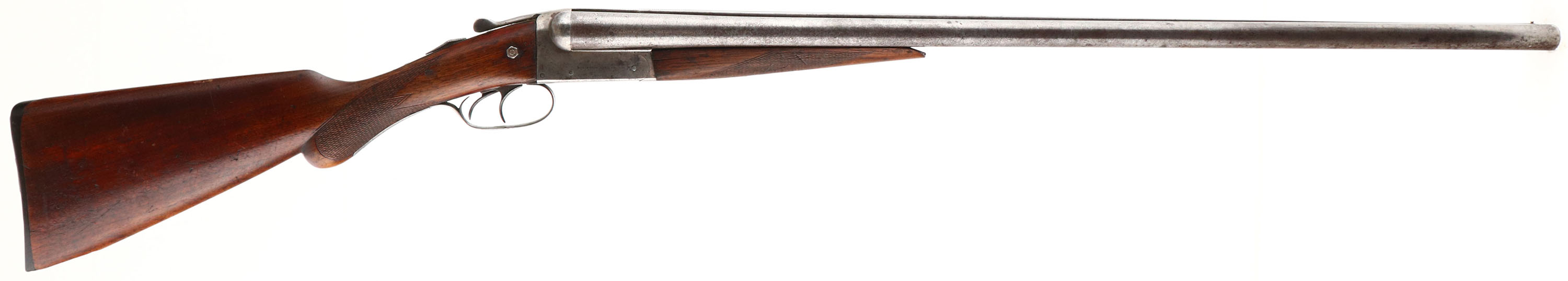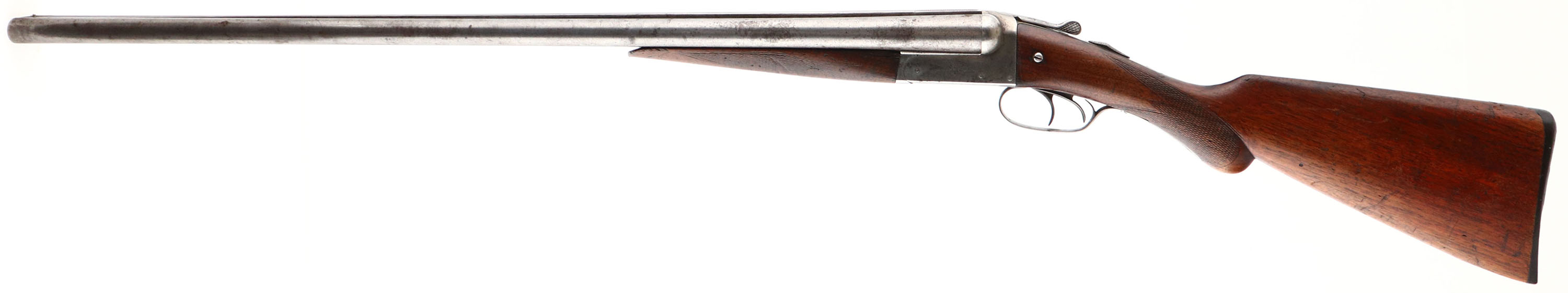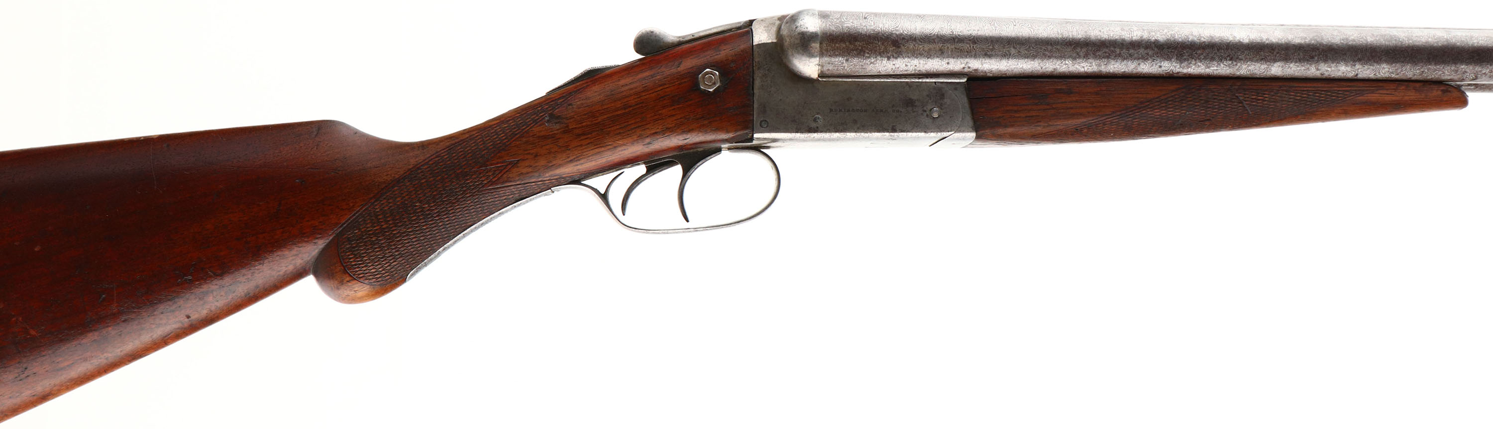 Remington, Model 1900, CAL: 12GA, MFG: 1900-1910, SN: 336394, Break Action SxS Shotgun. Choke: IM/IM, 30'' Damascus barrels. The checkered round knob wood stocks are good. There are multiple cracks in the forend, a large edge chip at the toe, one next to the receiver & multiple contusions, dings, & scrapes. The Damascus finish on the barrels is still prominent, worn to metal gray, with a thin brown patina & spotting toned to a brown patina. The case-hardened receiver has remnants of case-coloring in heavily protected areas, but mostly worn to metal gray, with spotting toned to a brown patina. Bores are good, with roughness & striations. The solid matted rib holds a single front bead. Stock has a RA checkered buttplate, with a toe chip. FFL or C&R Req. - Value: 200 to 400