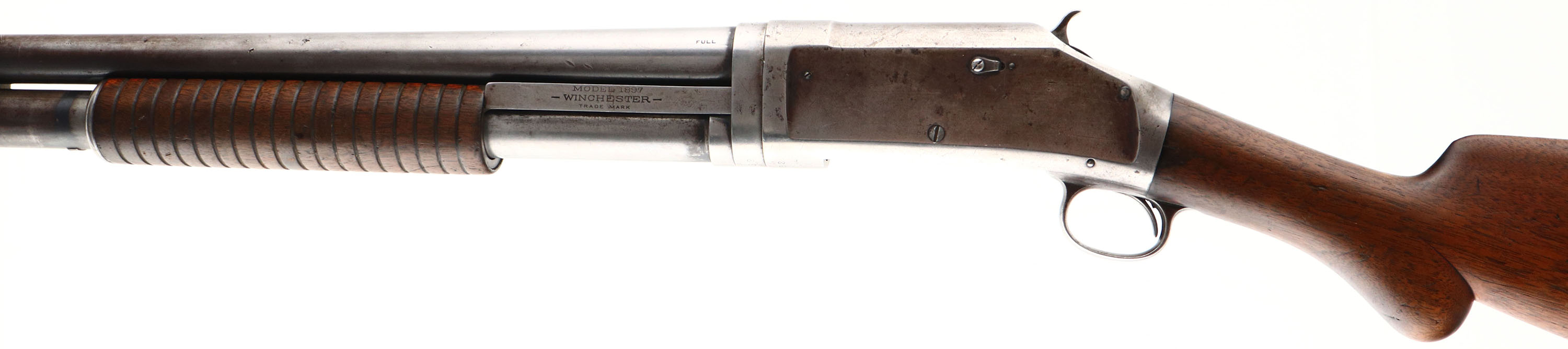 Winchester, Model 1897 Take-Down, CAL: 12 GA, MFG: 1905, SN: 294982, Pump Action Shotgun, Choke: Full, 2 3/4'', 28'' barrel. The original round pistol grip stock & corncob forend are very good & solid. The stocks have small to large scrapes, scratches, gouges, nicks & contusions to the original thinned finish. There is a 1'' & 2'' hairline cracks at the wrist emanating from the receiver & a 1'' crack & small chip at the right back edge of the forend. The metal blue finish has worn mostly gun metal gray, with remnants of original blue on the barrel. Bore is very good. Barrel holds a single front bead. Stock carries the original checkered metal buttplate. LOP 13 5/8''. FFL or C&R Req. - Value: 300 to 600