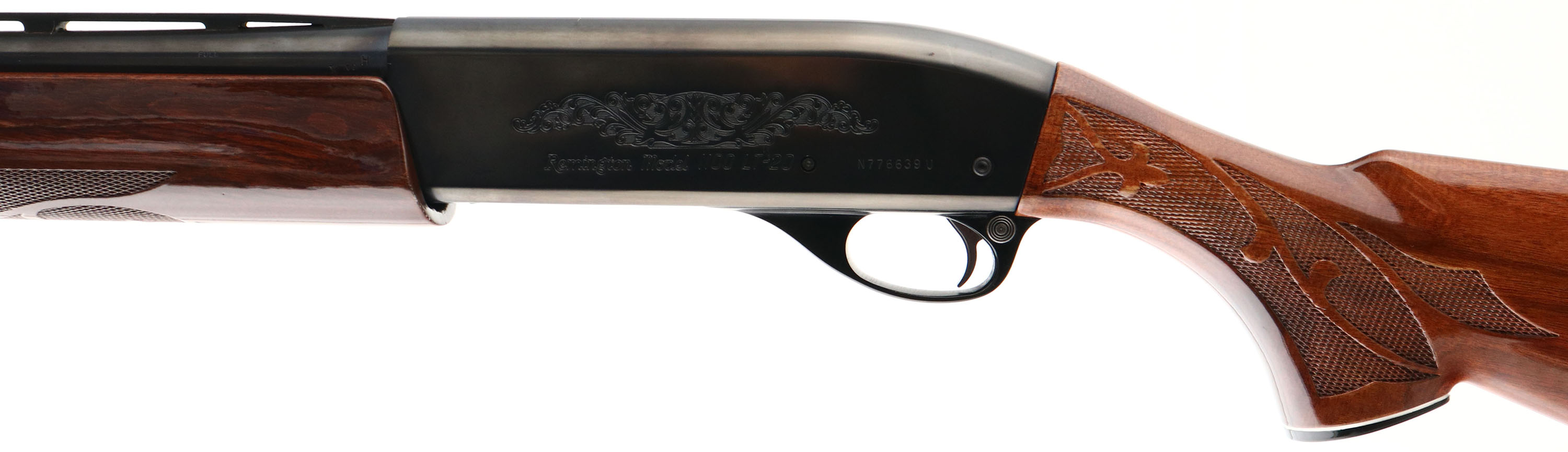 Remington, Model 1100 LT-20 MAG, CAL: 20 GA, MFG: 1982, SN: N776639U, Semi Auto Shotgun, Choke: Full, 3'', 28'' Ventilated rib barrel. The original checkered & capped pistol grip wood stocks are excellent, displaying light handling marks to the original finish. The metal blue finish rates 99% overall, with a couple minor blemishes. Bore is excellent & bright. The rib holds a single front bead. Buttstock carries a Remington ventilated recoil pad. A high condition & light weight shotgun in a popular gauge for upland birds. FFL Req. - Value: 600 to 1200