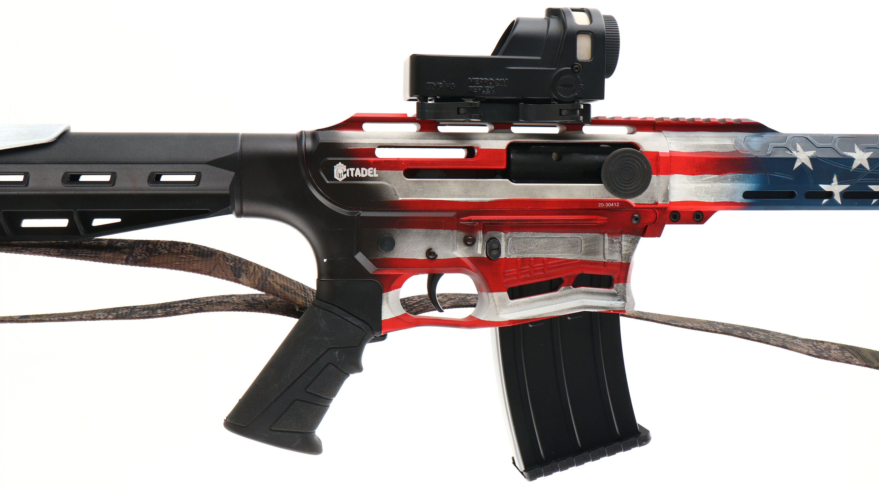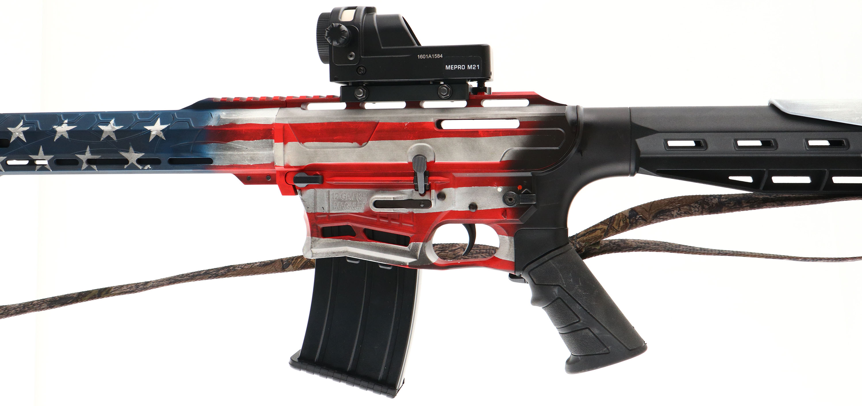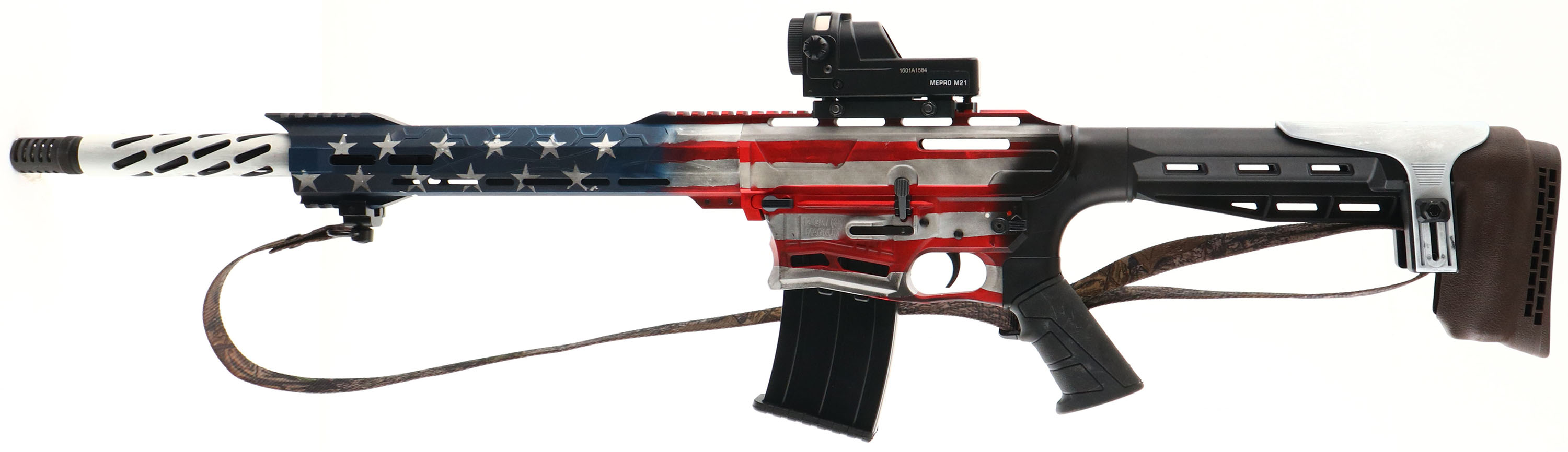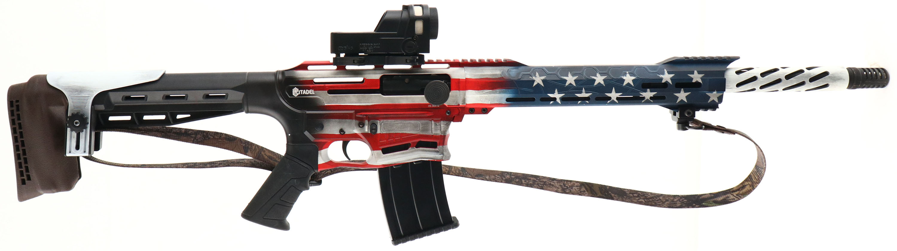 Citadel, Boss-25, CAL: 12GA, MFG: Modern, SN: 20-30412, Semi Auto Shotgun, 18'' /20 3/4'' with muzzle brake. The synthetic stock & rubber grip are excellent, with light handling wear. The American Flag Cerakote finish is excellent. Bore is excellent. Muzzle brake. MEPRO M21 Reflex sight. Upper Picatinny rails for optics & accessories. Camo sling. Comes with (3) additional magazines. FFL Req. - Value: 300 to 400