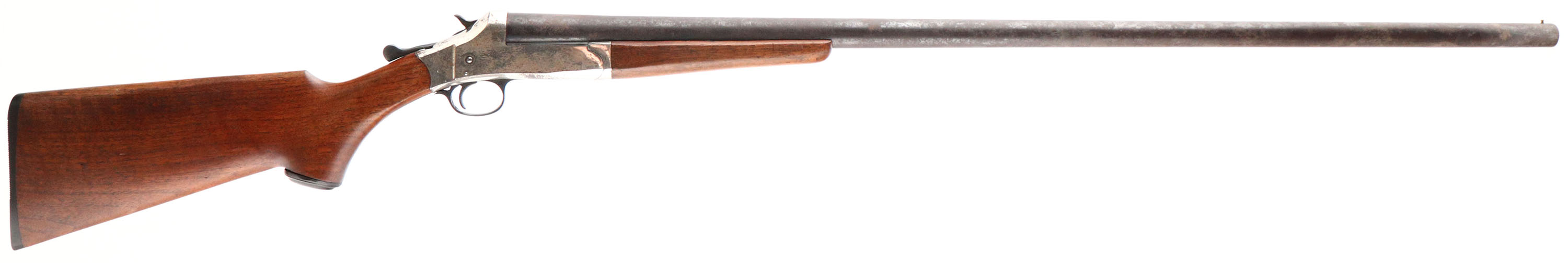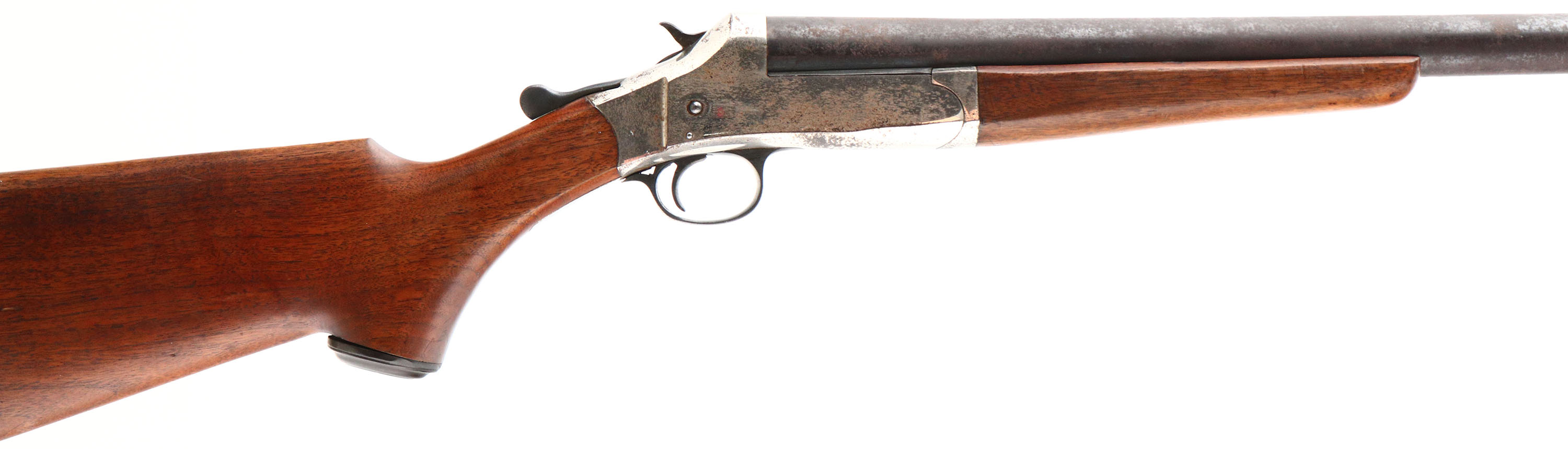 Belknap Hardware Co., Nitro Hunter, CAL: 12GA, MFG: 1890's-1930's, SN: A58472, Break Action Single Shot Shotgun, 36'' barrel. The capped pistol grip wood stocks are excellent. There are contusions & dings, mostly to the forend. The metal blue finish on the barrel has fully toned to a brown patina with consistent pitting throughout & the nickel finish on the receiver rates 60-70%, with consistent spotting throughout, toned to a brown patina. Bore is excellent. Brass bead front sight. Grooved plastic buttplate. FFL or C&R Req. - Value: 50 to 150