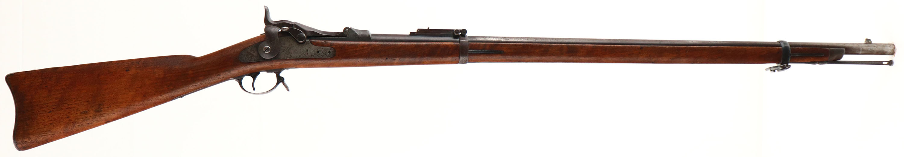 CONDITION: The straight wrist black walnut stock is very good as being lightly sanded & oiled. The stock also has various small nicks, dings, dents, scratches, & wear from use/age. There are a few cracks around the rear lock plate screw, on the left side of the stock. All that remains of the circle ''P'' proof on the bottom of the wrist is the faint remains of the circle. There is no visible inspectors cartouche on the stock. The heal of the stock has a cutout & screw holes for a tag. The metal has mostly toned to a chocolate brown patina with gun metal gray showing in areas & spotting of darker brown patina. The lock plate has worn to a gun metal gray with spotty patina. The left side of the barrel is stamped with a ''V'' over ''P'' over a eagles head, ''P'', ''I''. The top of the breech block is stamped ''U.S.'', ''MODEL'', ''1884''. The rear of the Receiver is marked with the S/N. The lock plate is marked with a American eagle, ''U.S.'', ''SPRINGFIELD'', the markings are starting to wear down & fade. Both barrel bands are marked ''U''.. The bore is very good. Its bright with strong rifling, but has a few spots of light roughness/pitting. The barrel holds a blade front sight with a Buffington rear sight. The stock carried a steel trapdoor buttplate that's worn gray & has roughness, nothing inside the trapdoor. The upper tang of the buttplate is marked ''US''. The stock carries both sling swivels with the stacking loop. Rifle has its cleaning rod. Antique No FFL Req.