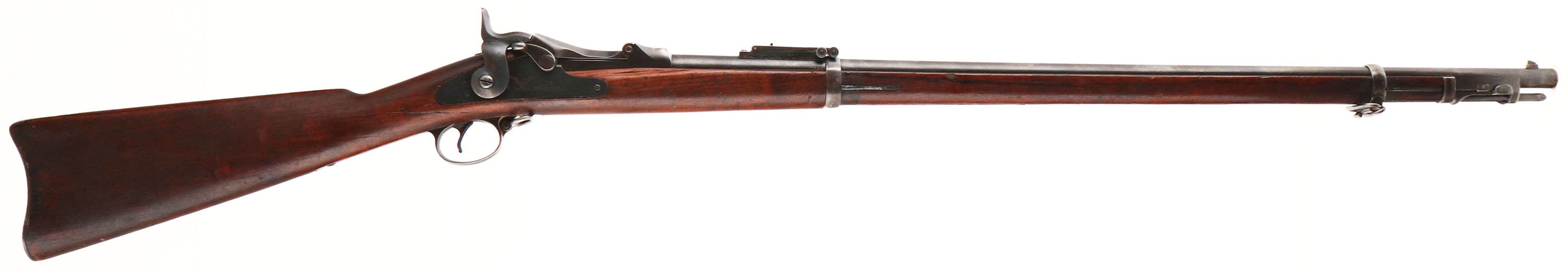 CONDITION: The straight wrist black walnut stock is good as being lightly sanded & re-finished. The stock also has various nicks, dings, gouges, scratches & wear from use/age. There are a few cracks around the wrist & lock plate, two emanate from the upper tang one goes down the wrist to the comb & the other wraps around to the lock plate, there are two more cracks/ gouges in the wood between the lock plate & trigger guard. There is also a large chunk of wood missing on the right side, right Infront of the lock plate, the edge has been sanded & smoothed & finished over. The left side of the stock above the trigger is marked with the Inspector cartouche ''SWP 1890''. The bottom of the wrist is marked with a faint circle ''P'' firing proof. The heal of the stock is stamped with a Faint ''20''. The metal has mostly toned to a brown patina with consistent roughness & spots of gun metal gray. There are spots of tool ding marks down the barrel & some metal components. The lock plate has been blued & has spots of thinning & punch marks. The left side of the barrel is stamped with a ''V'' over ''P'' over a eagles head, ''P'', ''I''. The top of the breech block is stamped ''U.S.'', ''MODEL'', ''1884'', the marking is thinned & partially gone. The rear of the Receiver is marked with the S/N. The lock plate is marked with a American eagle, ''U.S.'', ''SPRINGFIELD''. Both barrel bands are marked ''U''. The bore is good. Its bright with consistent roughness & spots of light pitting. The barrel holds a blade front sight with a Buffington rear sight. The stock carried a steel trapdoor buttplate that's worn gray & has roughness, nothing inside the trapdoor. The stock carries both sling swivels with the stacking loop. Rifle has its Rod Bayonet/ cleaning rod. Antique No FFL Req.