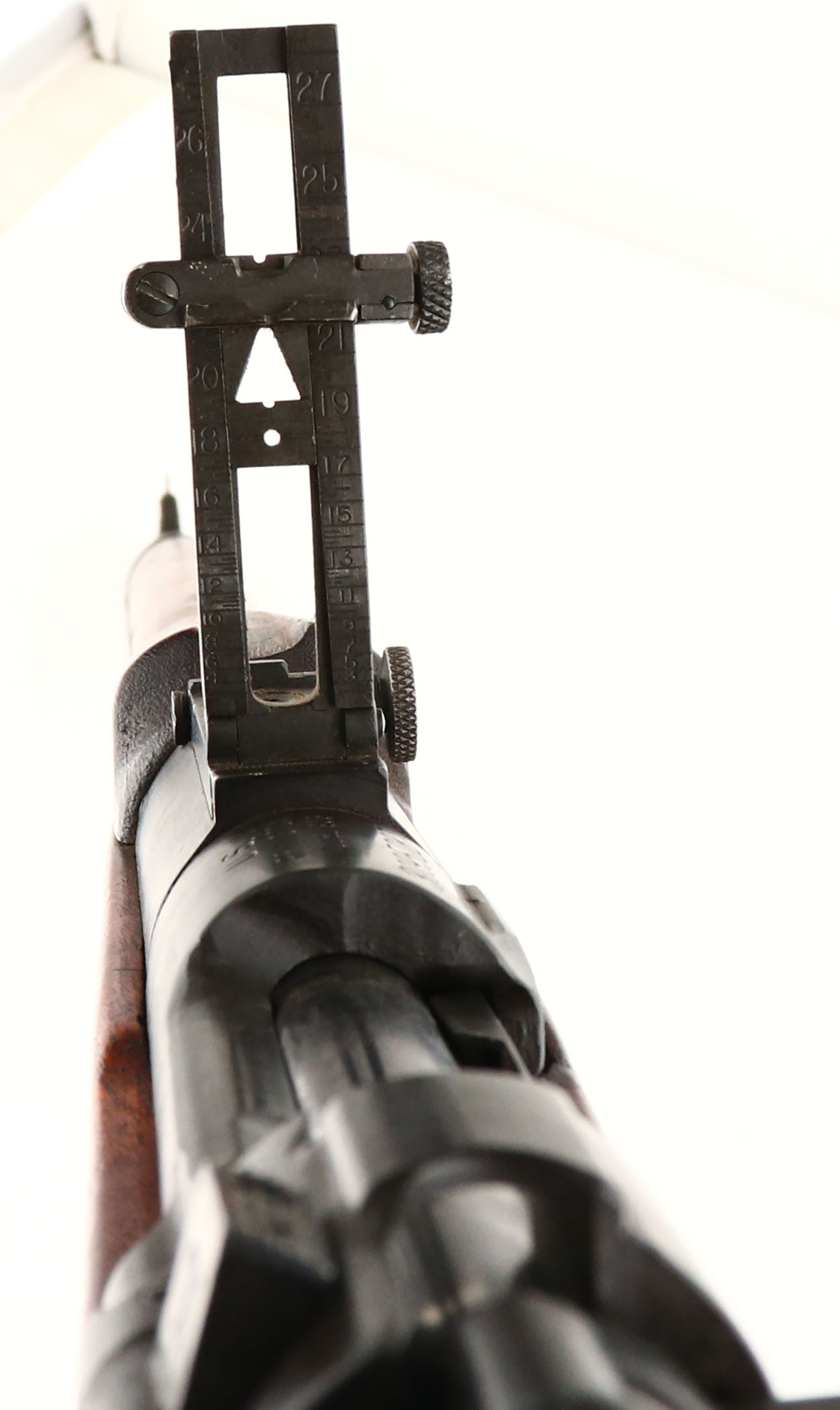 CONDITION: The straight wrist walnut stock is very good with light nicks, dings, scratches, & wear from use/age. There is a small part of the stock that has been notched out on the right side, at the rear receiver bridge that was done to mount a new rear sight. The left side of the stock above the trigger is marked with a very faint ''AA'', & a less faint ''AAHO'' in a box. The bottom of the wrist is stamped with a ''P'' firing proof. The bottom of the stock Infront of the magazine is stamped with a ''C''. The dark parkerized finish rates 85% overall with areas of wear & thinning. The top of the receiver is marked ''U.S.'', ''REMINGTON'', ''MODEL1903'', & the S/N. the top end of the barrel is marked ''R A'', flaming bomb, ''4-42''. The right side of the rear receiver bridge has two small holes that were drilled & tapped for a rear sight, screws still inside the holes. All small parts including the bolt are marked ''R'' meaning they are Remington made. The bore is Excellent. Its bright & mirror like with strong rifling, bore is the 4 groove rifling. The barrel holds a blade front sight with a Buffington rear sight. The stock carries a parkerized steel trapdoor buttplate, nothing inside trapdoor. Rifle has the rear sling swivel & the stacking swivel but is missing the front sling swivel. FFL or C&R Req.