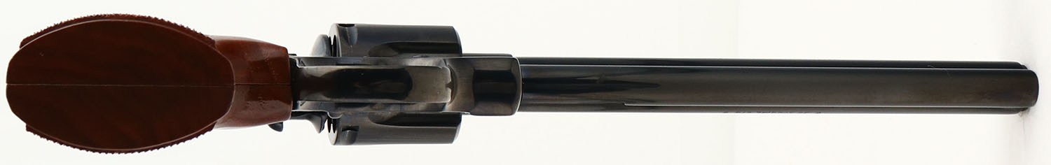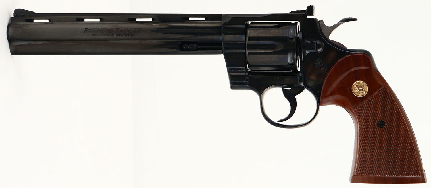 OUTSTANDING, Colt, Python Target, CAL: .38SPL, MFG: 1960, SN: LA9255, Double Action Revolver, 8'' barrel. The original Colt logo medallion checkered wood grips are near mint. The original metal blue finish rates 99% overall, with a couple minor blemishes. Bore is excellent. The frame has an adjustable rear sight & the ventilated rib holds a pinned blade front sight. This is the highest condition Python Target we have seen come through the auction. Only 3,489 mfg making this example rare. A must-have for a Colt collector. FFL or C&R Req. - Value: 3000 to 4000